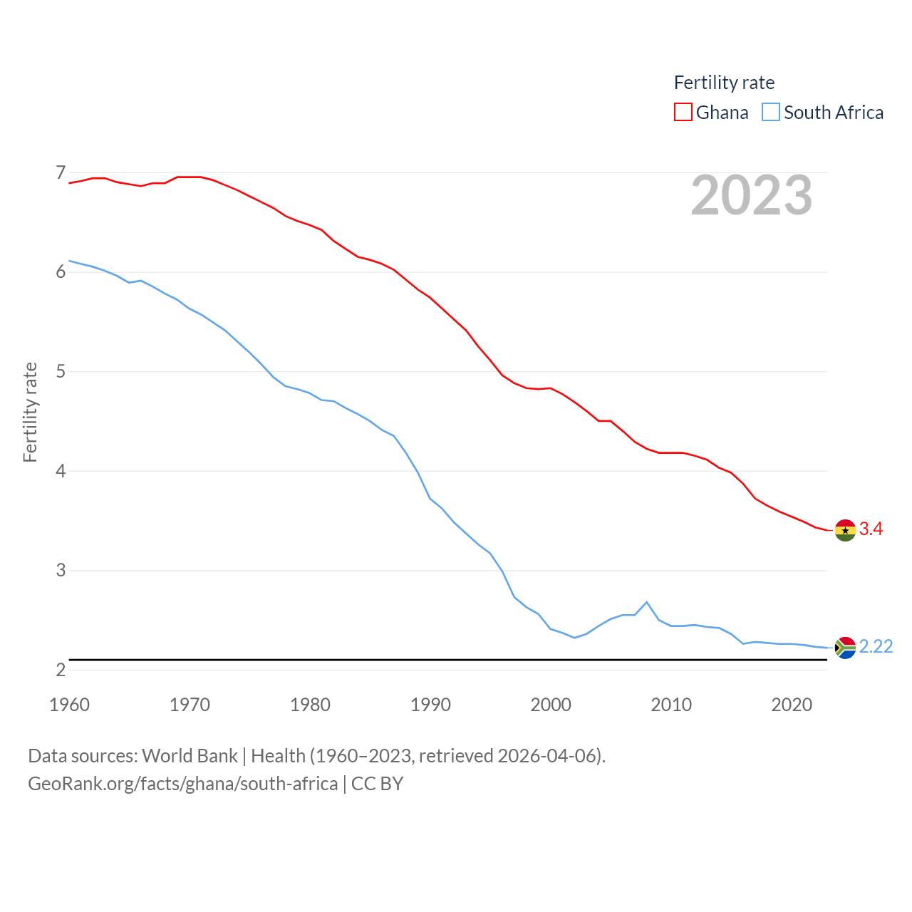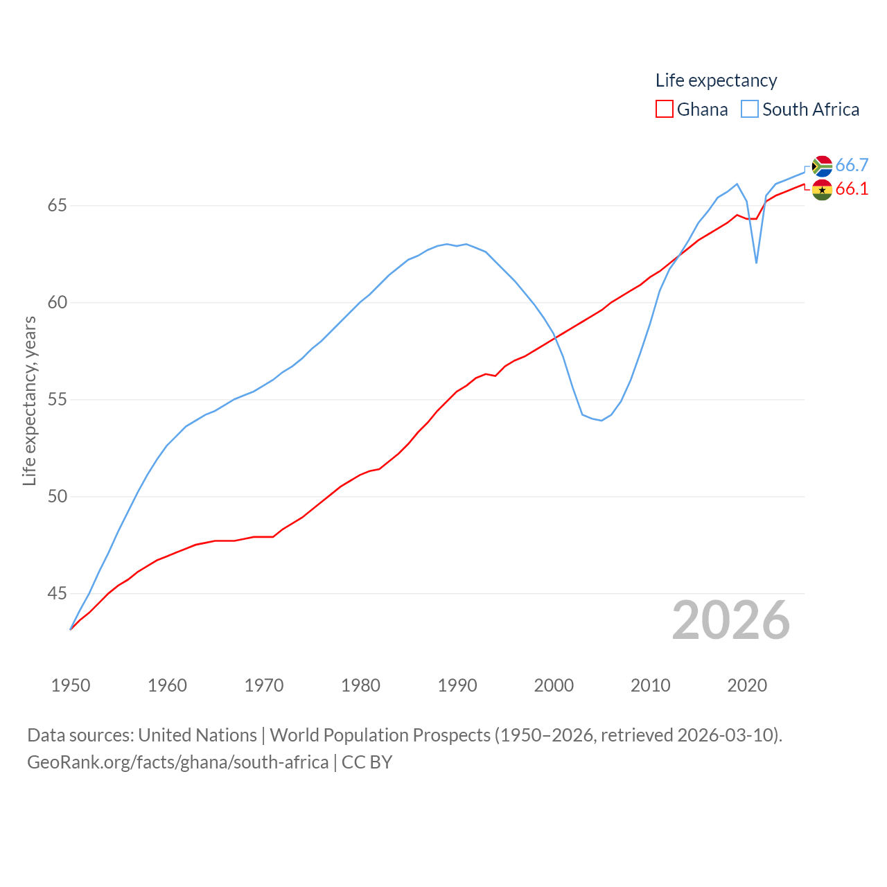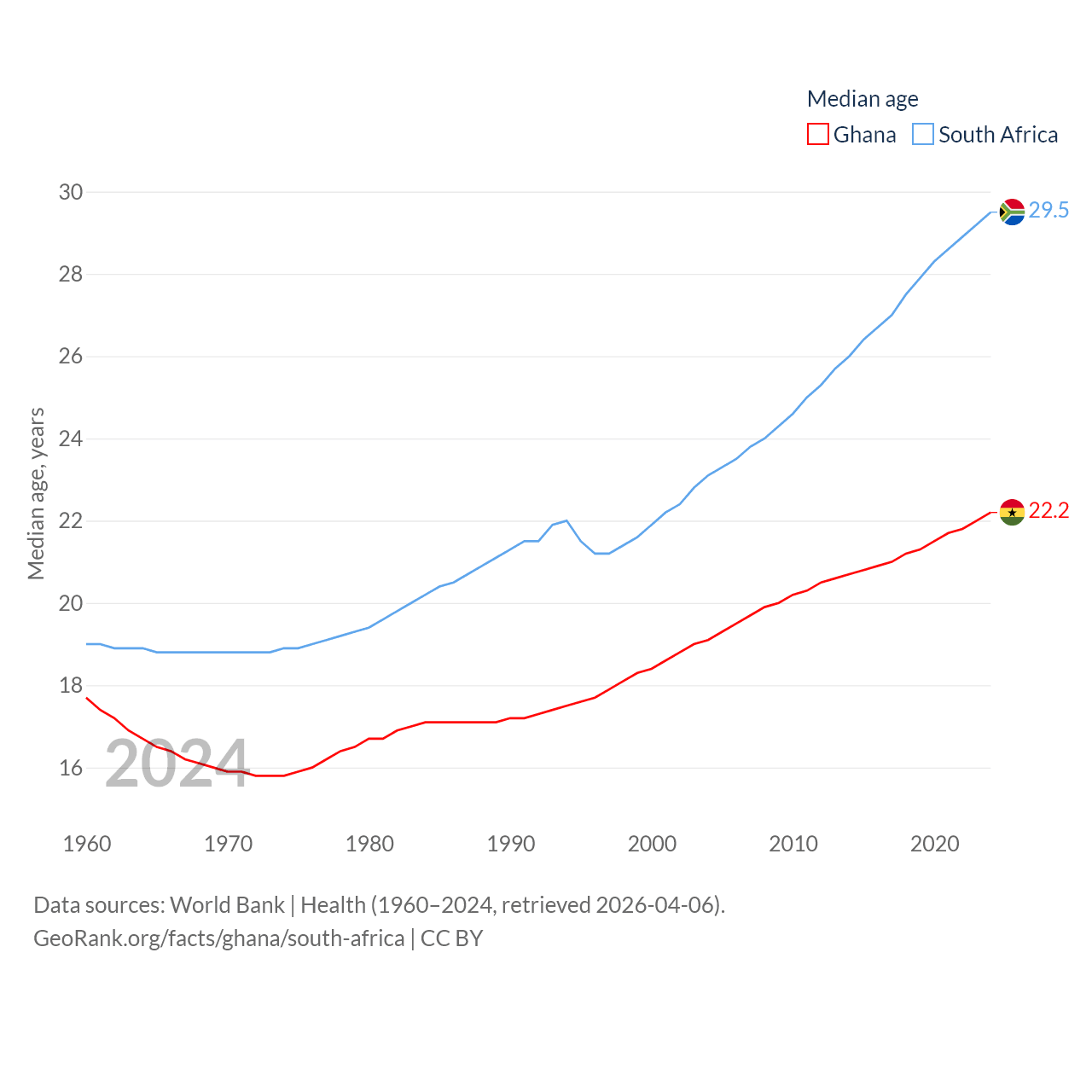 Ghana has a population of 34.4M (ranked 47/197), compared with 64M in South Africa (ranked 24/197). Ghana's land area is 87,851 sq mi versus 468,377 sq mi for South Africa (ranked 81st vs. 24th).