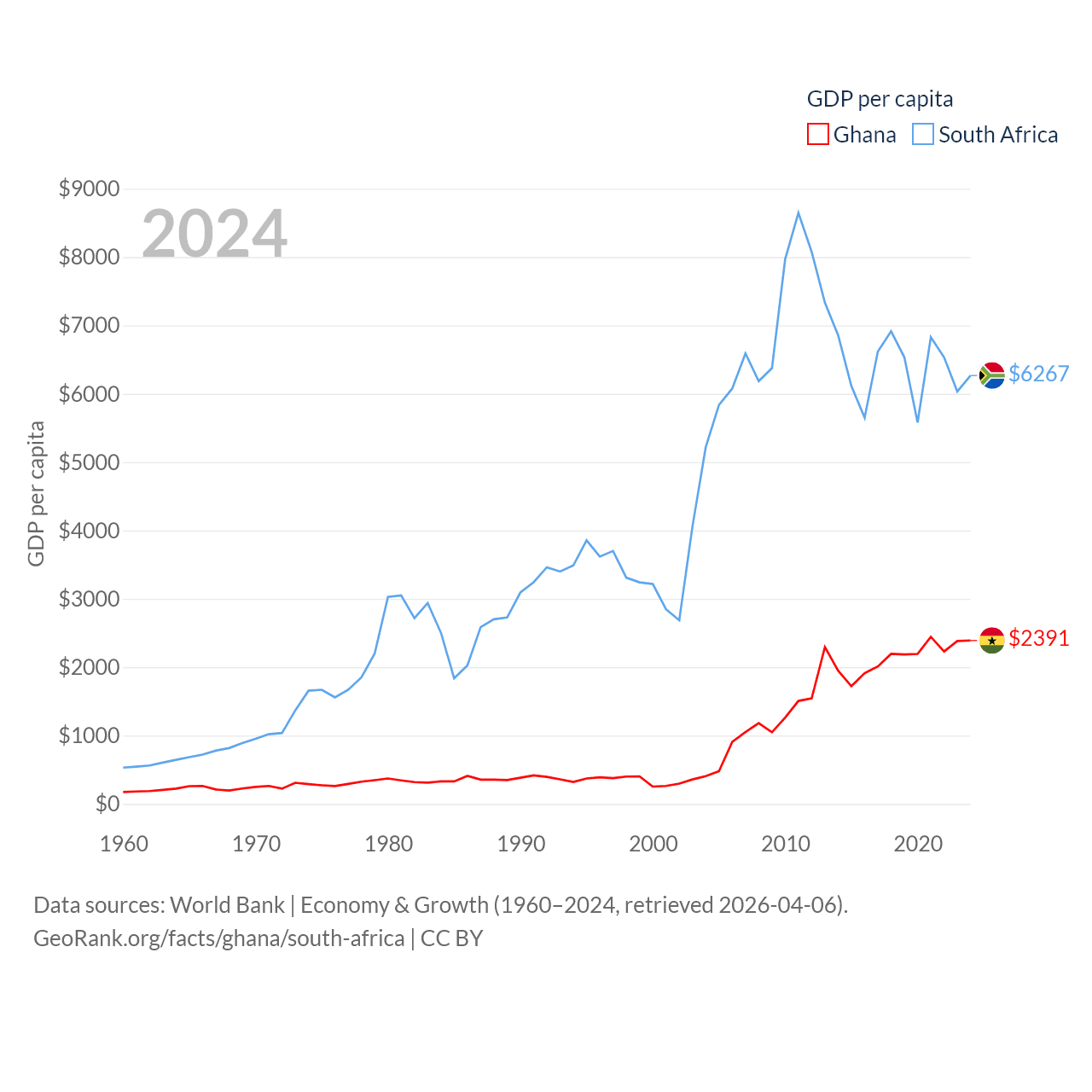By GDP, Ghana ranks 80/197 ($82.3B) and South Africa ranks 40/197 ($401B). By GDP per capita, Ghana ranks 151/197 ($2,391), while South Africa ranks 111/197 ($6,267).