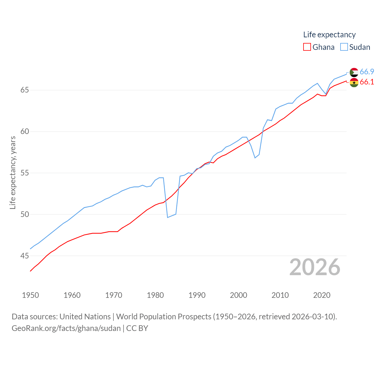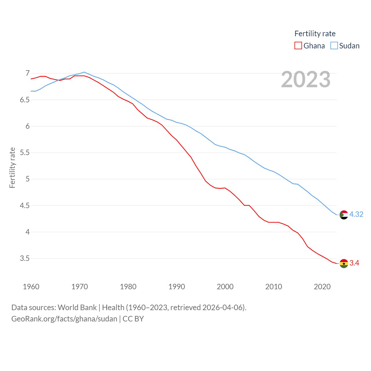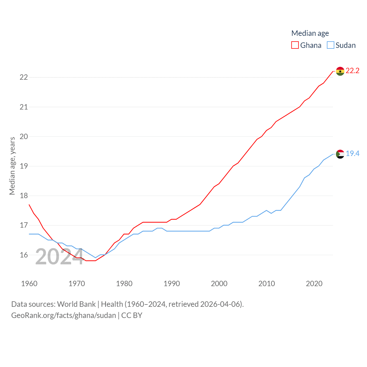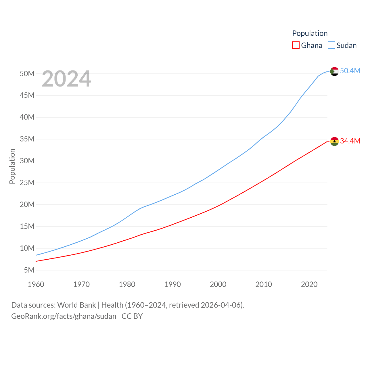 Ghana has a population of 34.4M (ranked 47/197), compared with 50.4M in Sudan (ranked 30/197). Ghana's land area is 87,851 sq mi versus 721,239 sq mi for Sudan (ranked 81st vs. 15th).