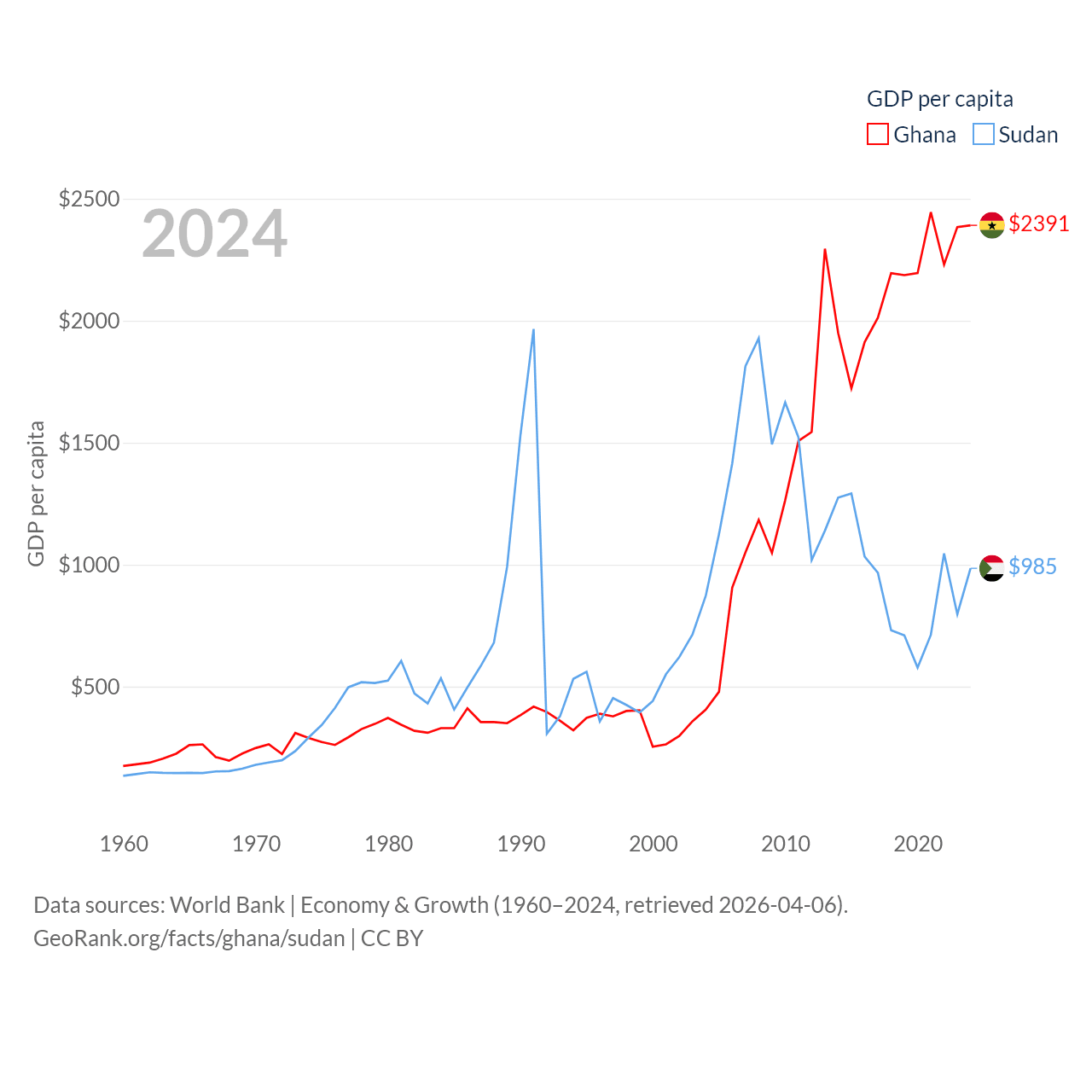 By GDP, Ghana ranks 80/197 ($82.3B) and Sudan ranks 94/197 ($49.7B). By GDP per capita, Ghana ranks 151/197 ($2,391), while Sudan ranks 179/197 ($985).
