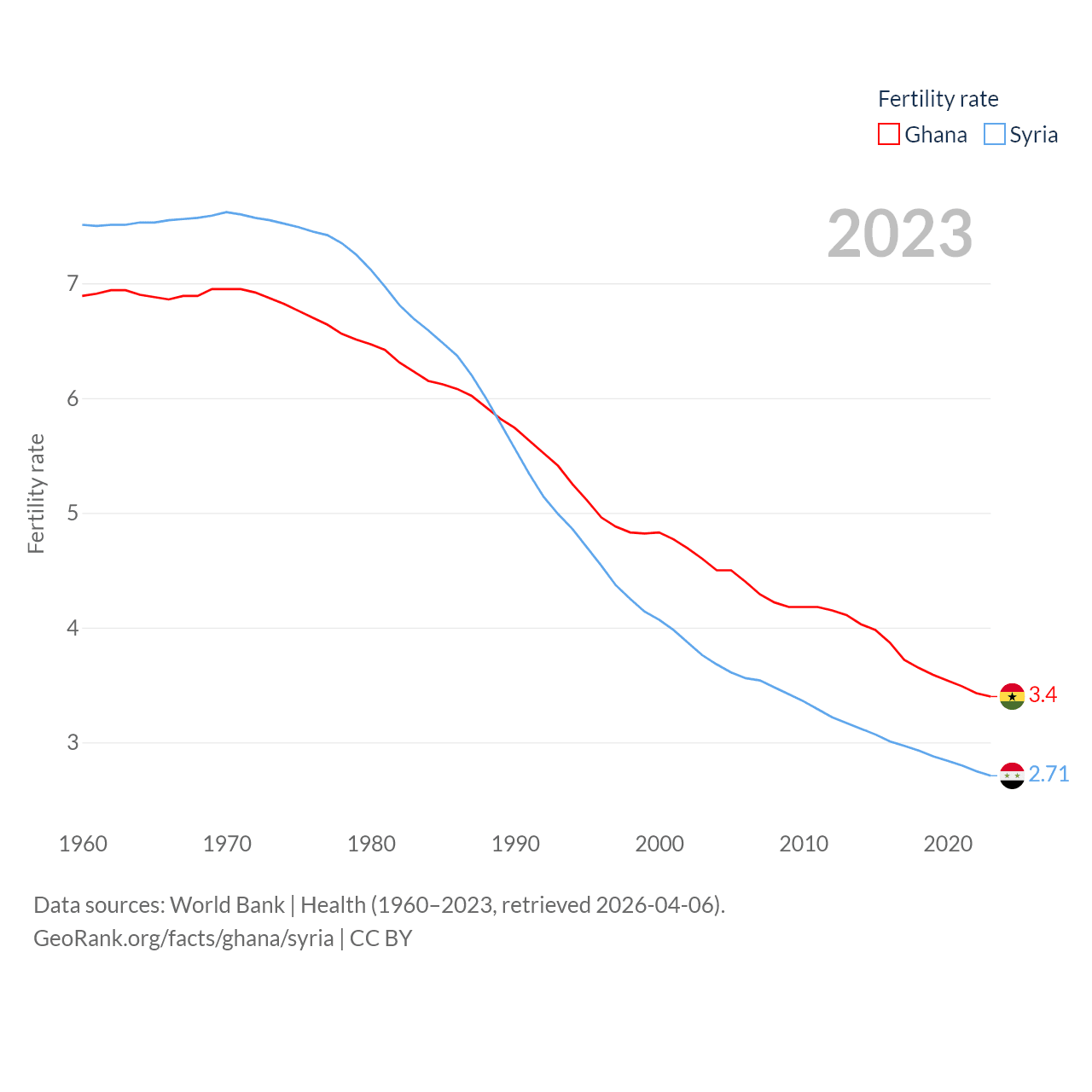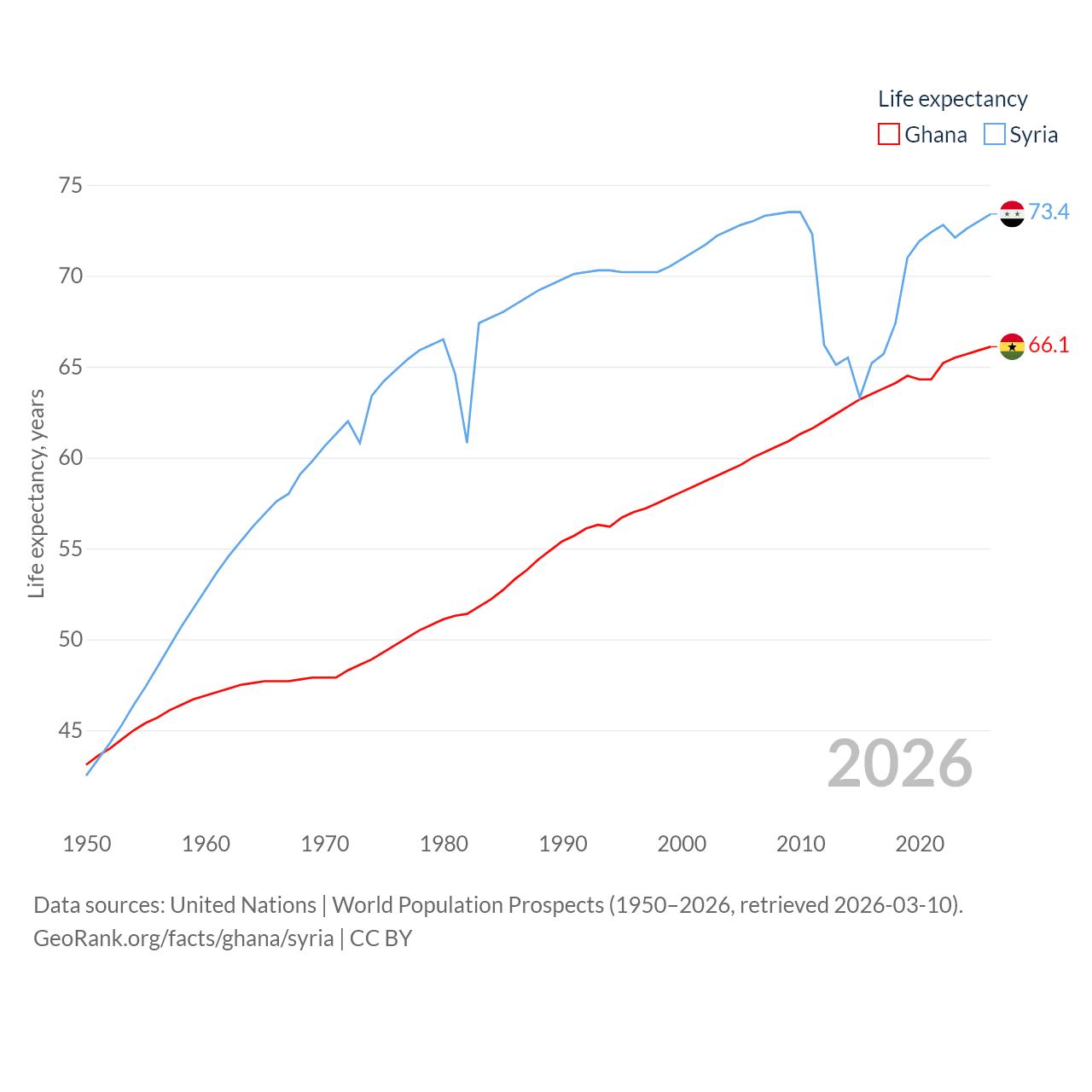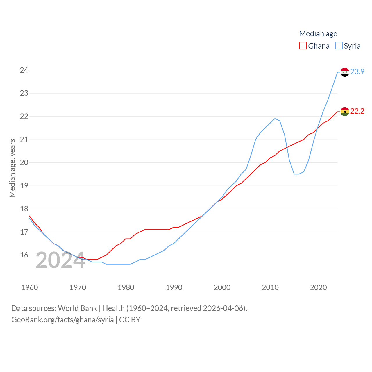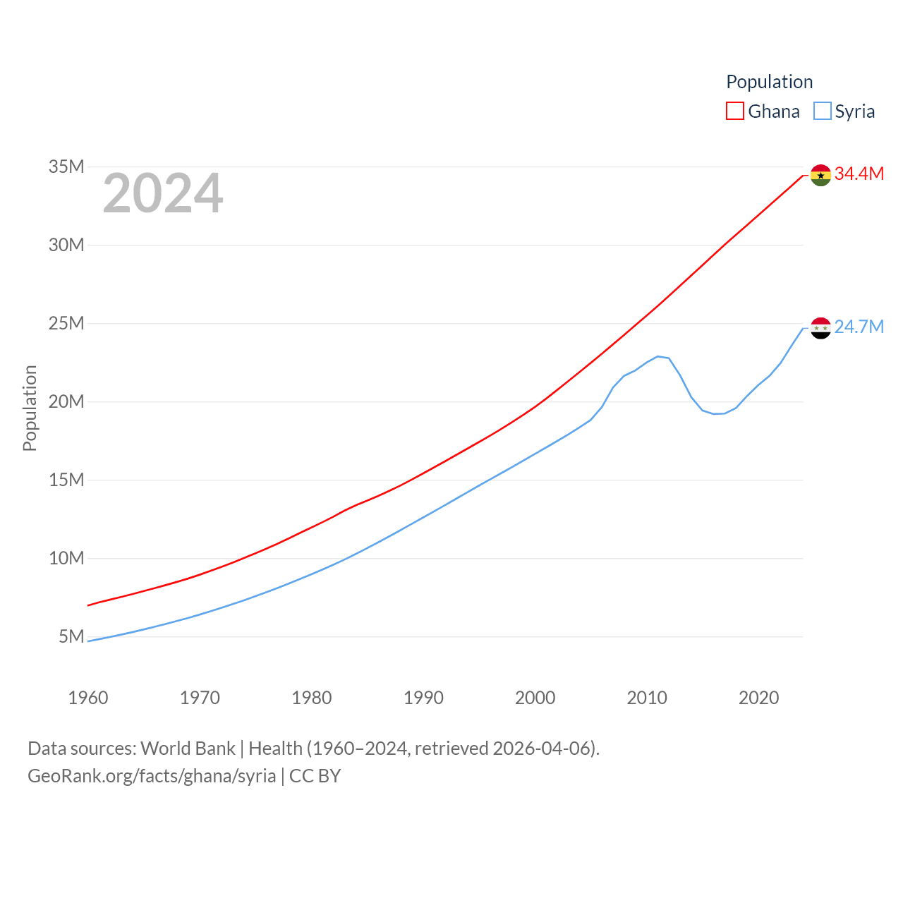 Ghana has a population of 34.4M (ranked 47/197), compared with 24.7M in Syria (ranked 57/197). Ghana's land area is 87,851 sq mi versus 70,900 sq mi for Syria (ranked 81st vs. 87th).
