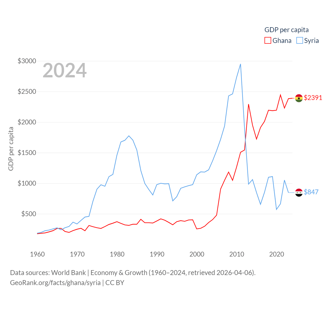 By GDP, Ghana ranks 80/197 ($82.3B) and Syria ranks 129/197 ($20B). By GDP per capita, Ghana ranks 151/197 ($2,391), while Syria ranks 185/197 ($847).