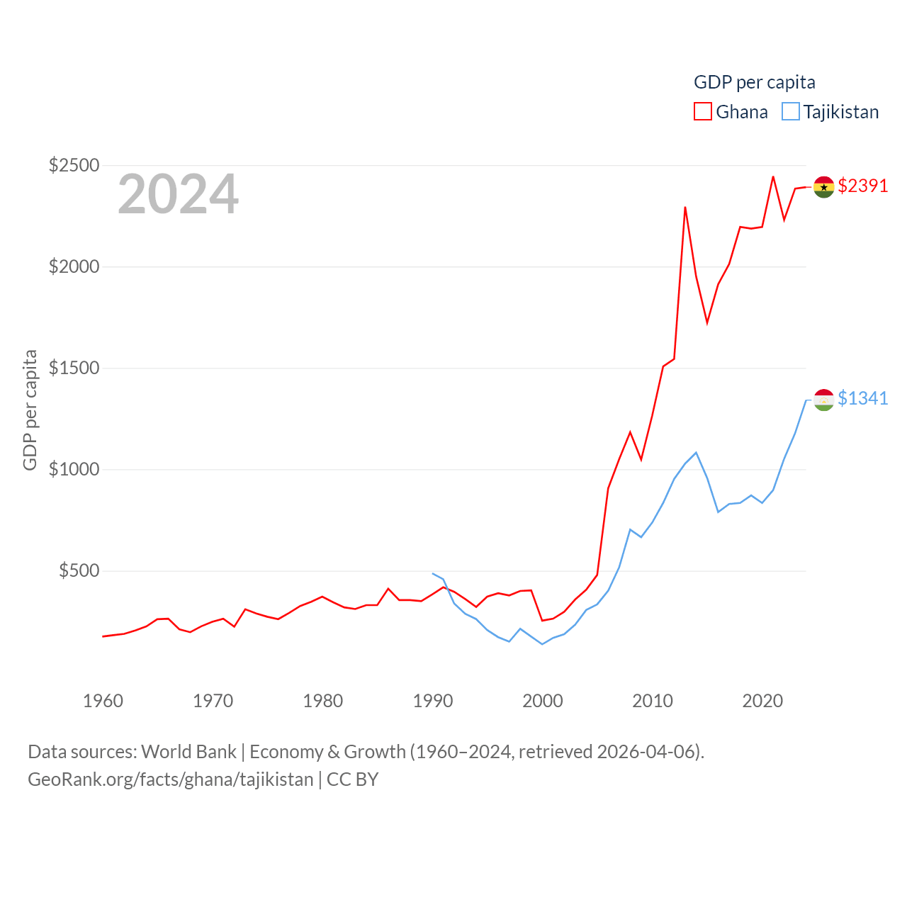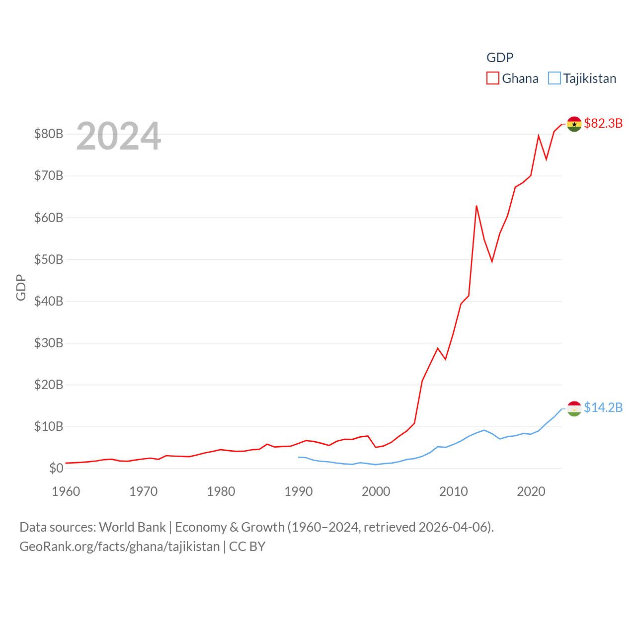By GDP, Ghana ranks 80/197 ($82.3B) and Tajikistan ranks 145/197 ($14.2B). By GDP per capita, Ghana ranks 151/197 ($2,391), while Tajikistan ranks 166/197 ($1,341).