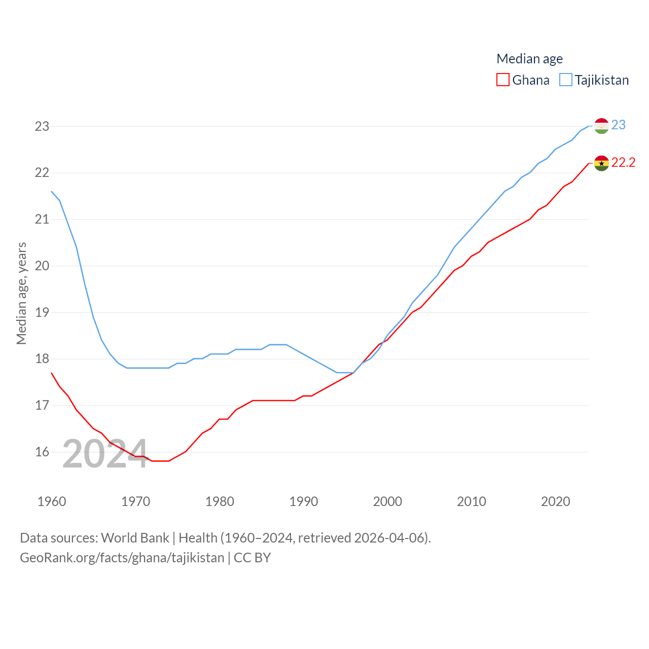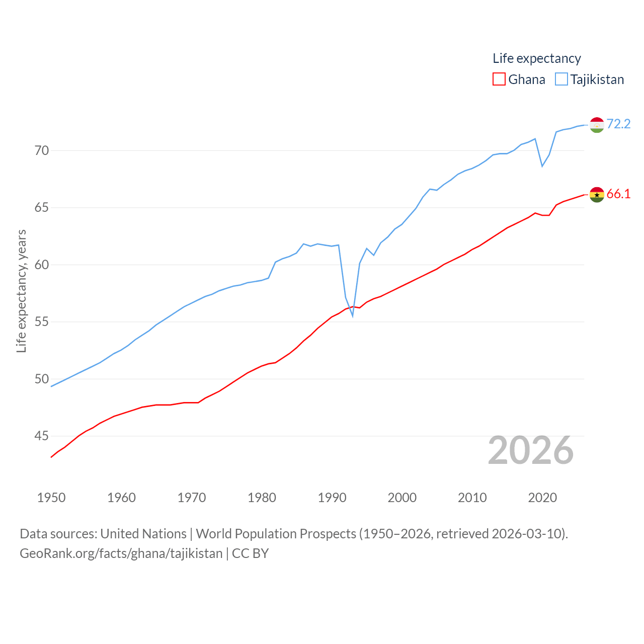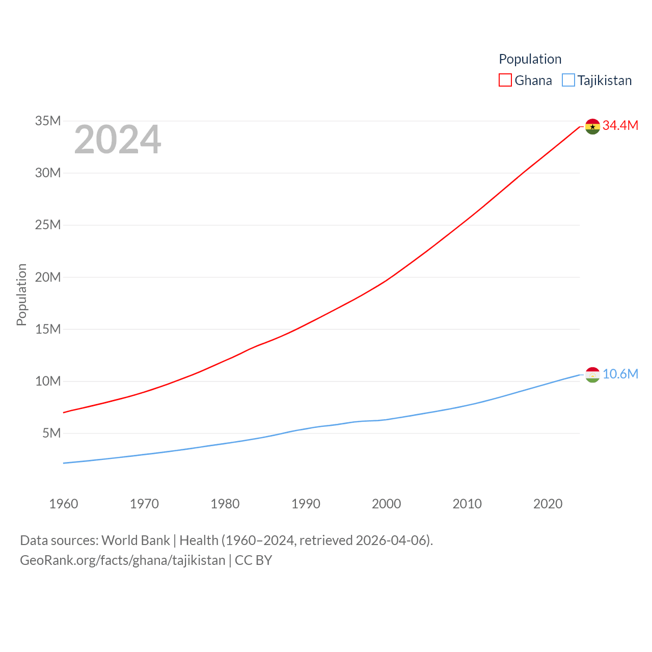 Ghana has a population of 34.4M (ranked 47/197), compared with 10.6M in Tajikistan (ranked 91/197). Ghana's land area is 87,851 sq mi versus 53,587 sq mi for Tajikistan (ranked 81st vs. 93rd).