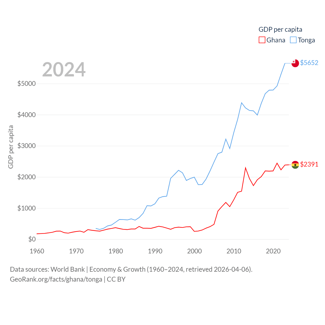 By GDP, Ghana ranks 80/197 ($82.3B) and Tonga ranks 191/197 ($591M). By GDP per capita, Ghana ranks 151/197 ($2,391), while Tonga ranks 115/197 ($5,652).