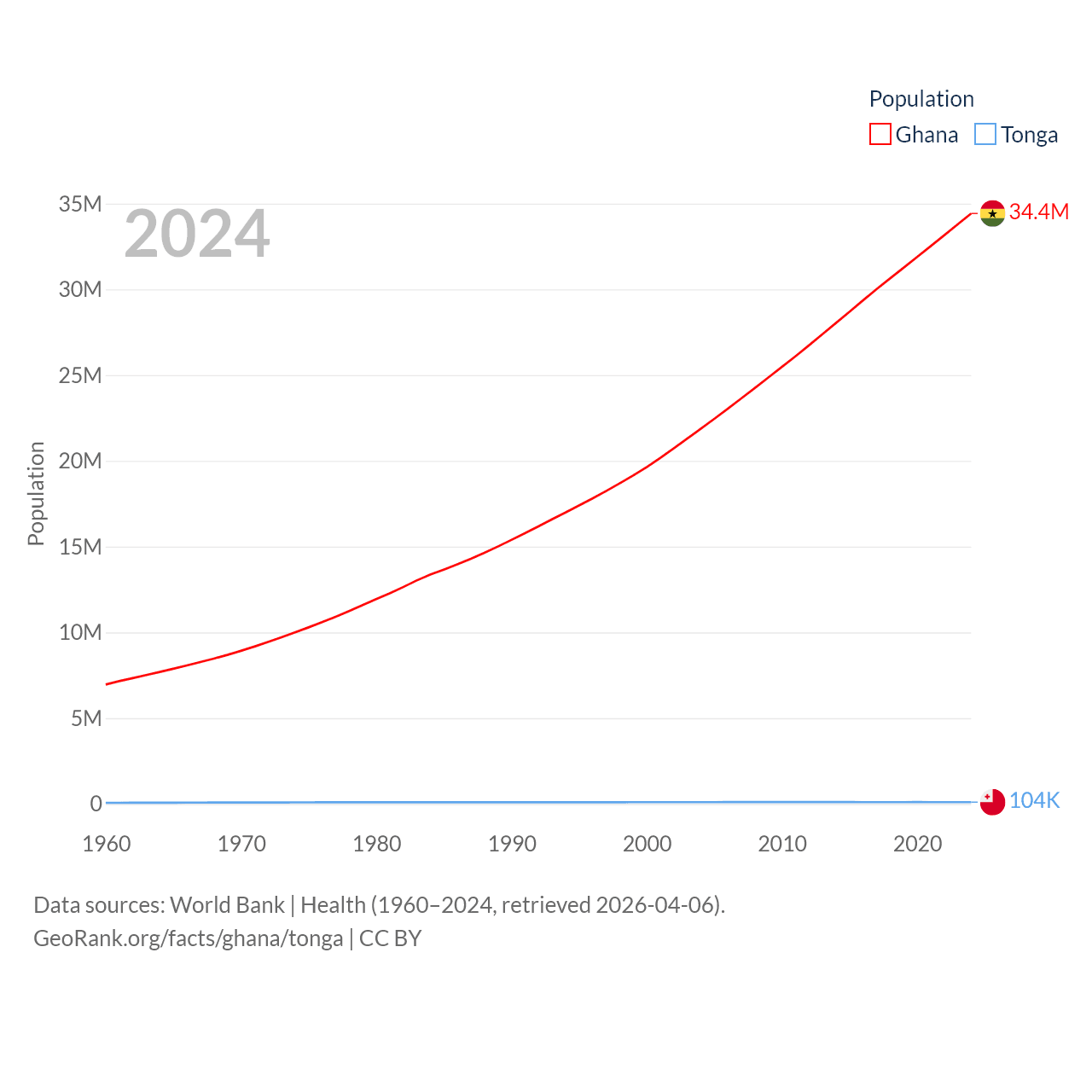 Ghana has a population of 34.4M (ranked 47/197), compared with 104K in Tonga (ranked 183/197). Ghana's land area is 87,851 sq mi versus 278 sq mi for Tonga (ranked 81st vs. 176th).