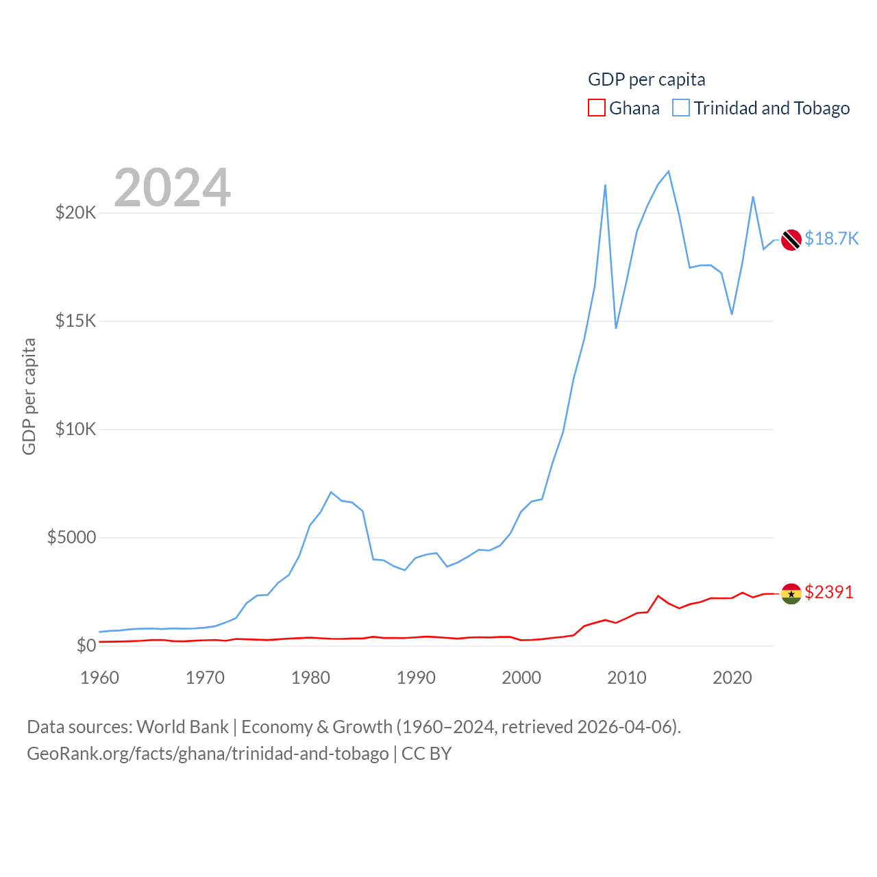 By GDP, Ghana ranks 80/197 ($82.3B) and Trinidad and Tobago ranks 115/197 ($25.6B). By GDP per capita, Ghana ranks 151/197 ($2,391), while Trinidad and Tobago ranks 61/197 ($18,733).