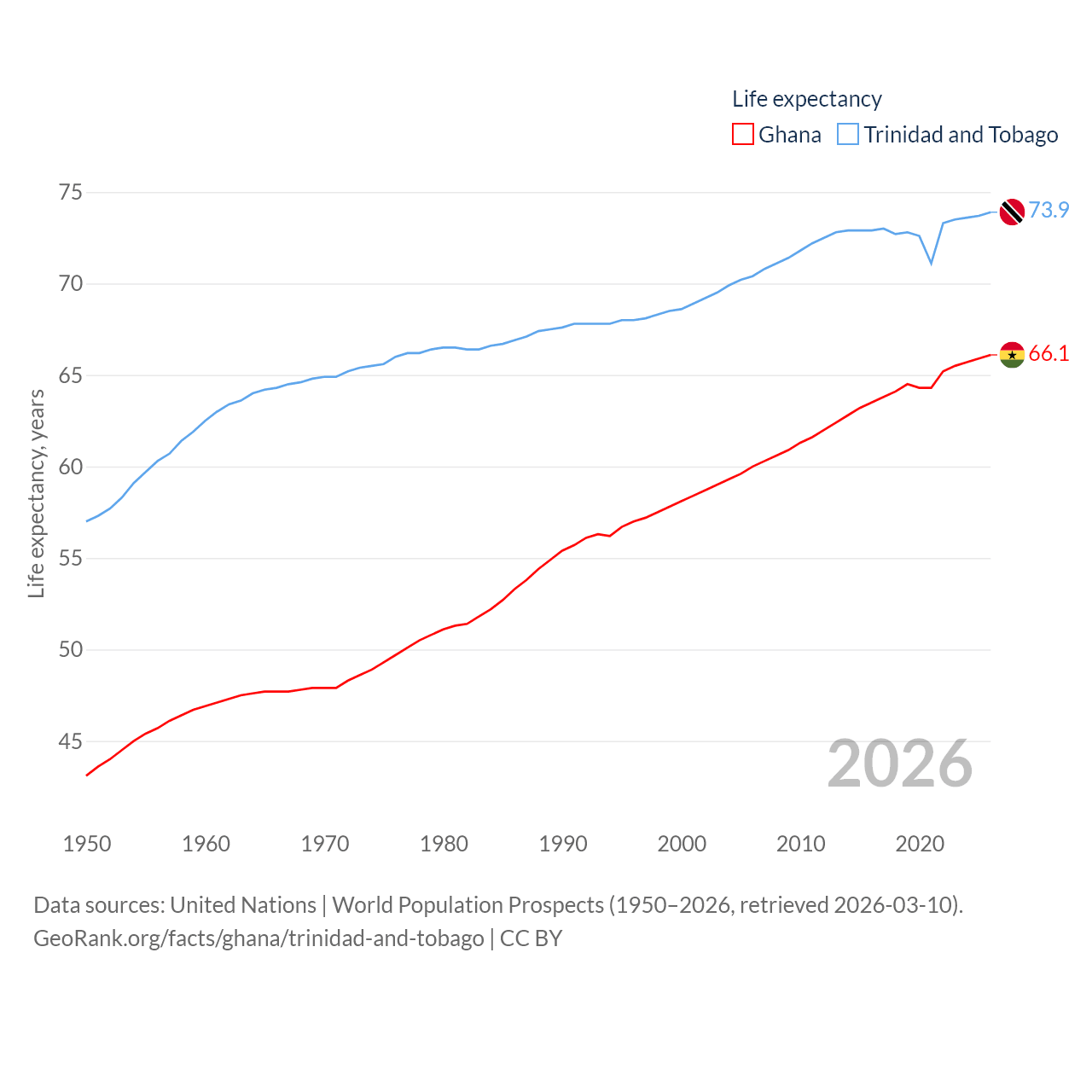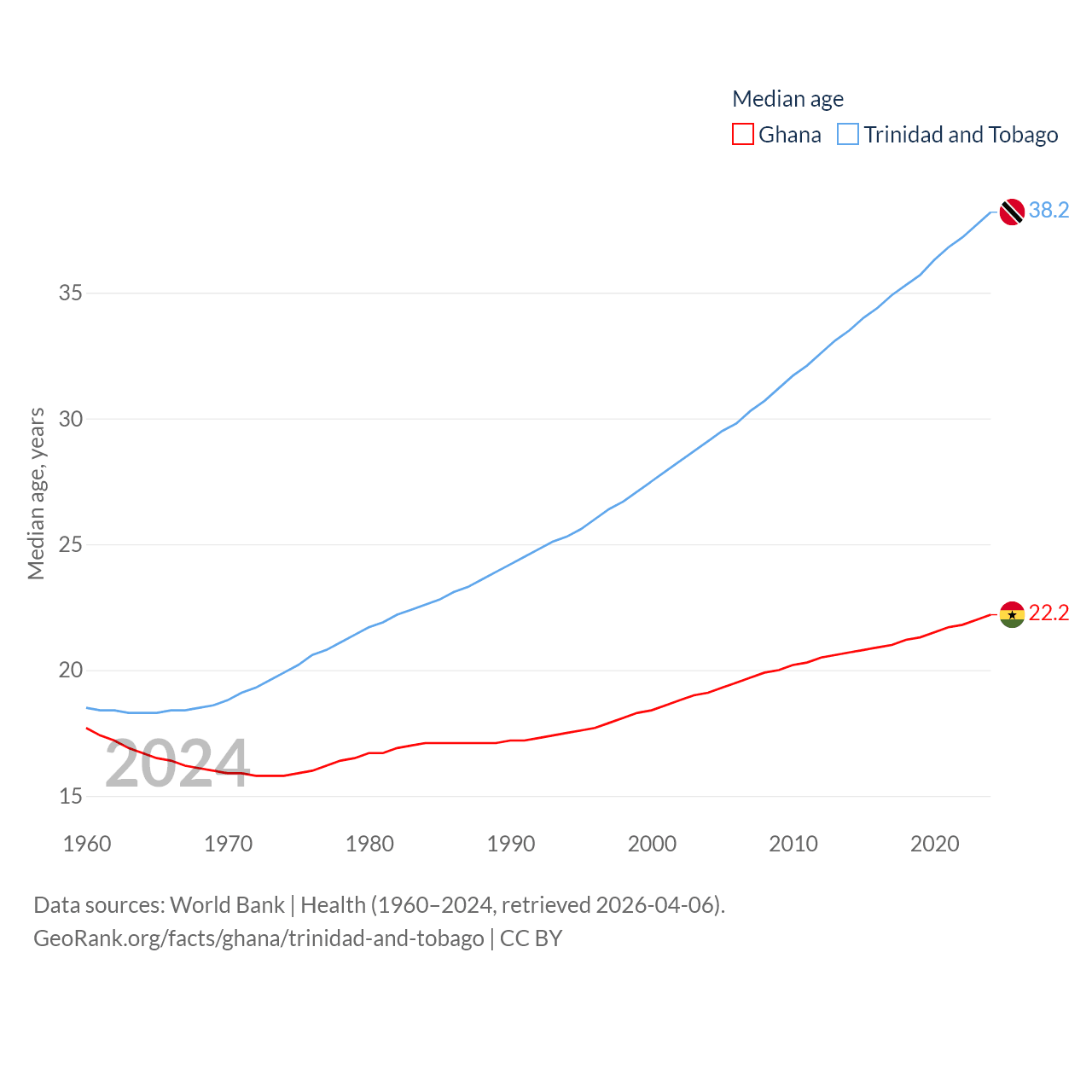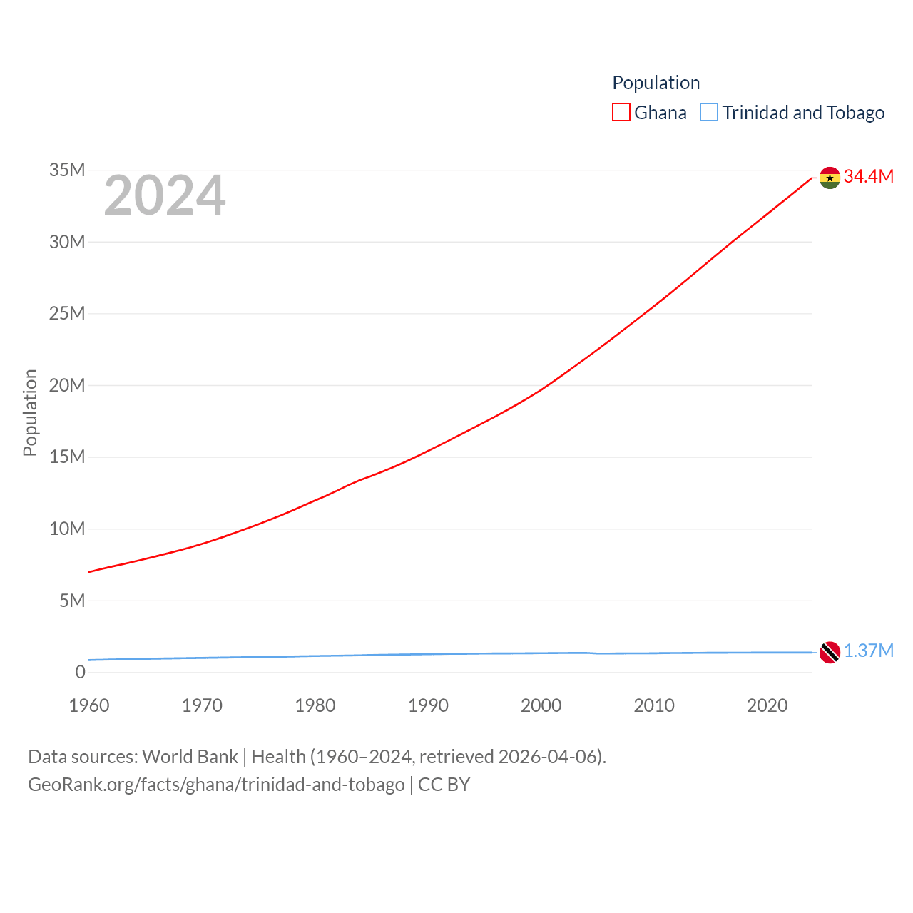 Ghana has a population of 34.4M (ranked 47/197), compared with 1.37M in Trinidad and Tobago (ranked 154/197). Ghana's land area is 87,851 sq mi versus 1,981 sq mi for Trinidad and Tobago (ranked 81st vs. 166th).