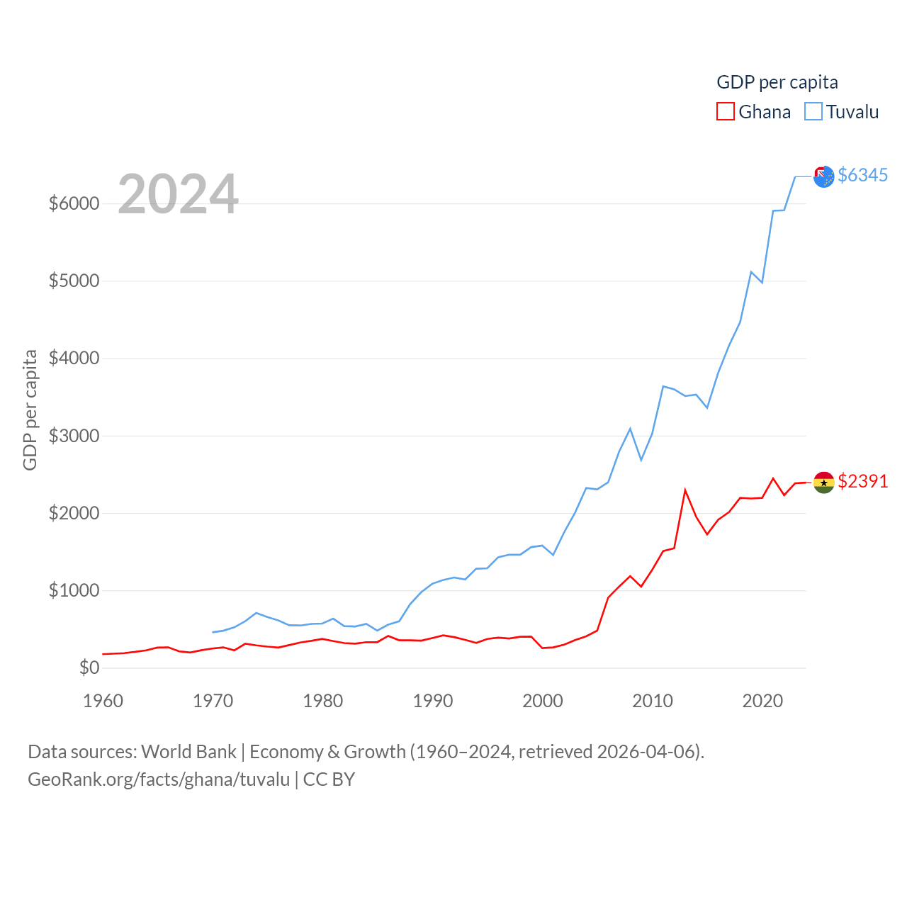 By GDP, Ghana ranks 80/197 ($82.3B) and Tuvalu ranks 196/197 ($62.3M). By GDP per capita, Ghana ranks 151/197 ($2,391), while Tuvalu ranks 110/197 ($6,345).
