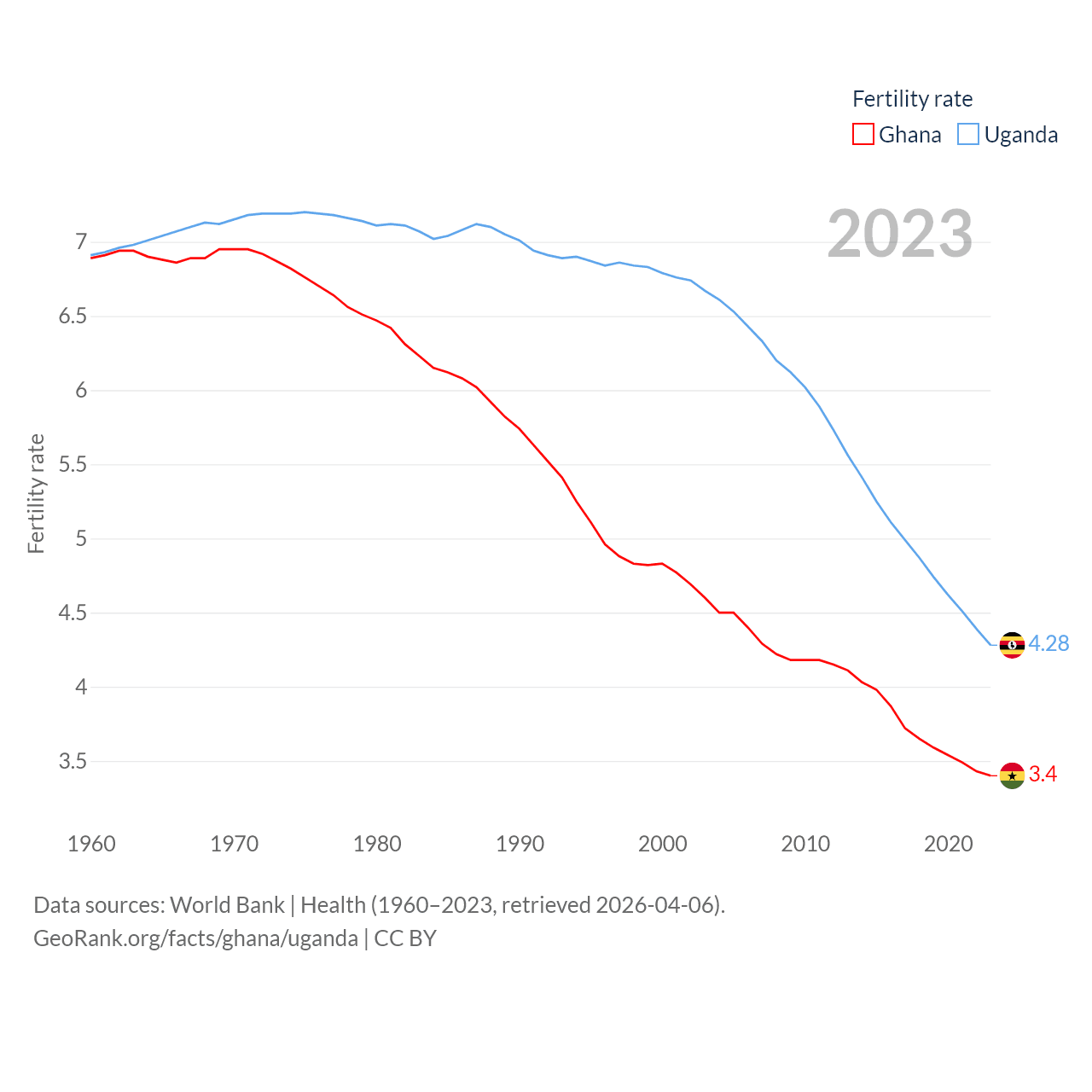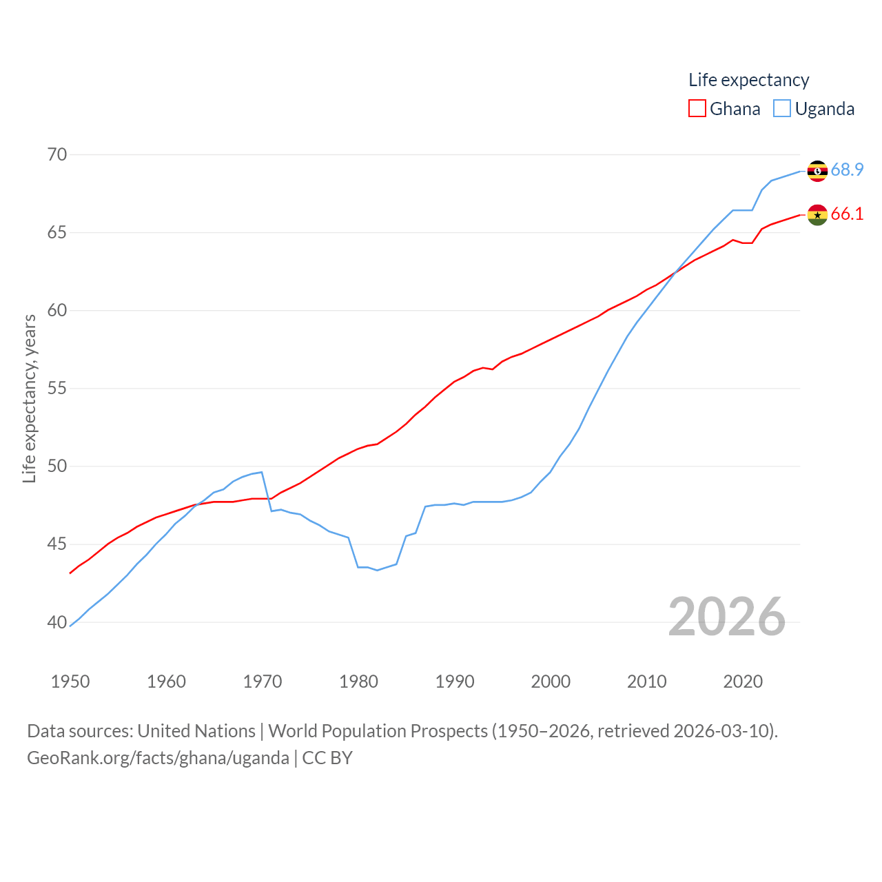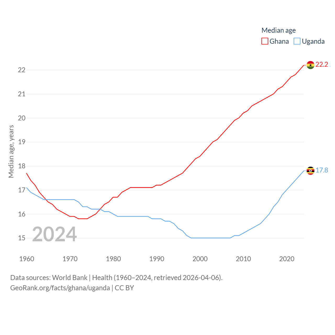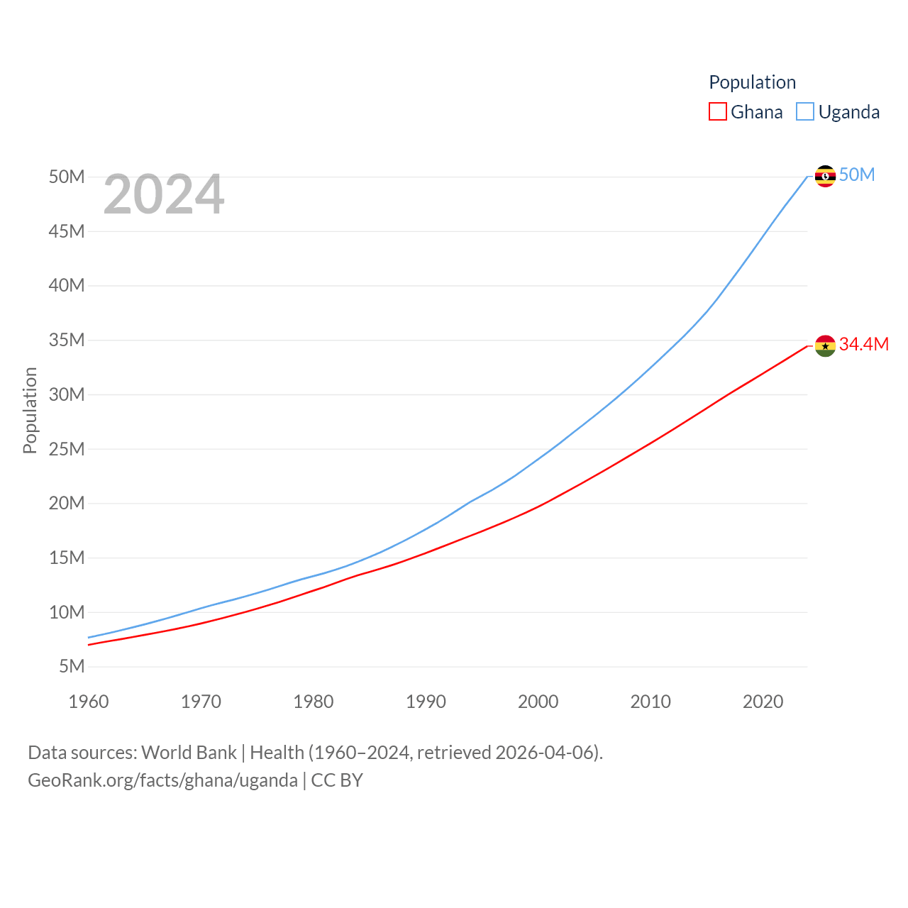 Ghana has a population of 34.4M (ranked 47/197), compared with 50M in Uganda (ranked 31/197). Ghana's land area is 87,851 sq mi versus 77,421 sq mi for Uganda (ranked 81st vs. 84th).
