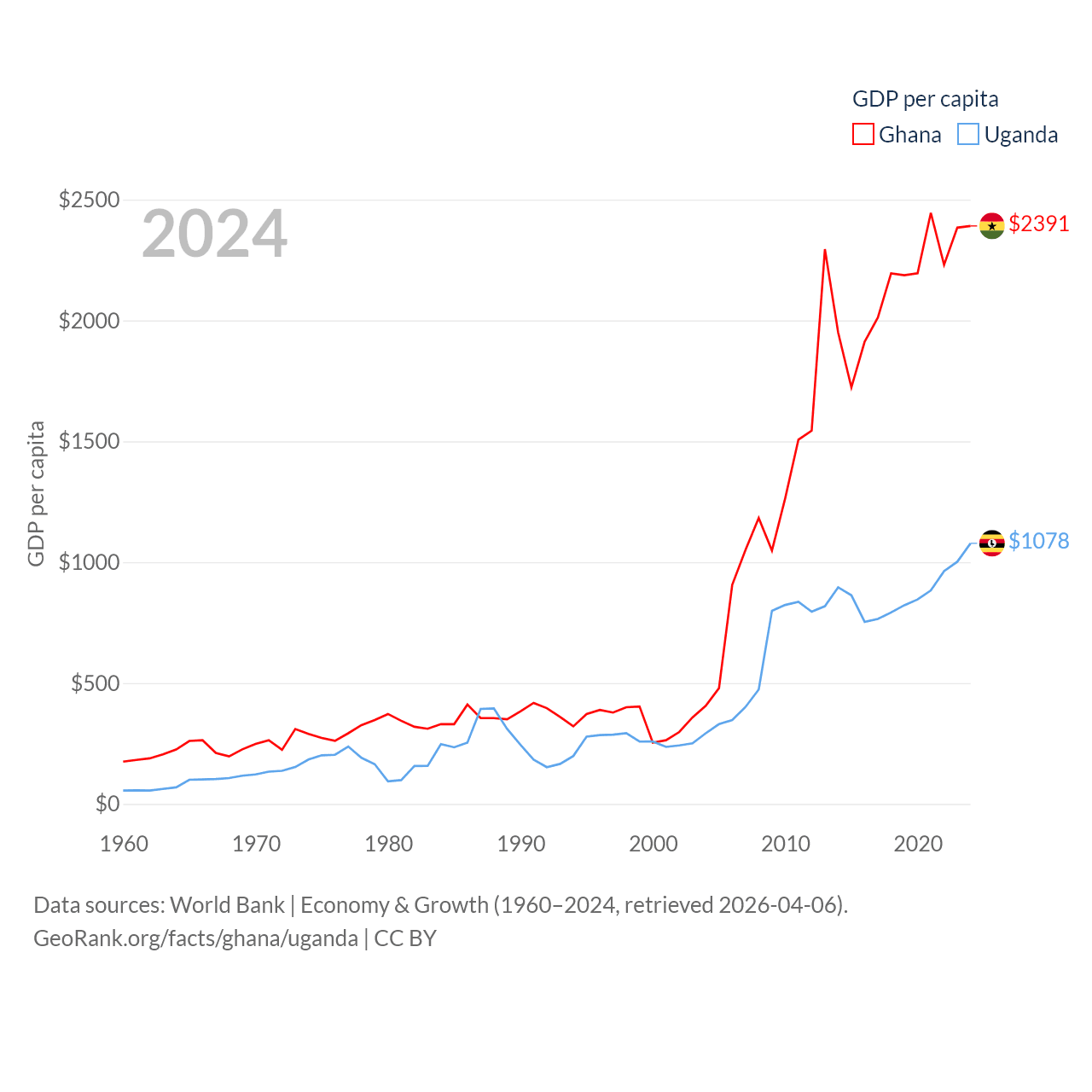 By GDP, Ghana ranks 80/197 ($82.3B) and Uganda ranks 89/197 ($53.9B). By GDP per capita, Ghana ranks 151/197 ($2,391), while Uganda ranks 176/197 ($1,078).