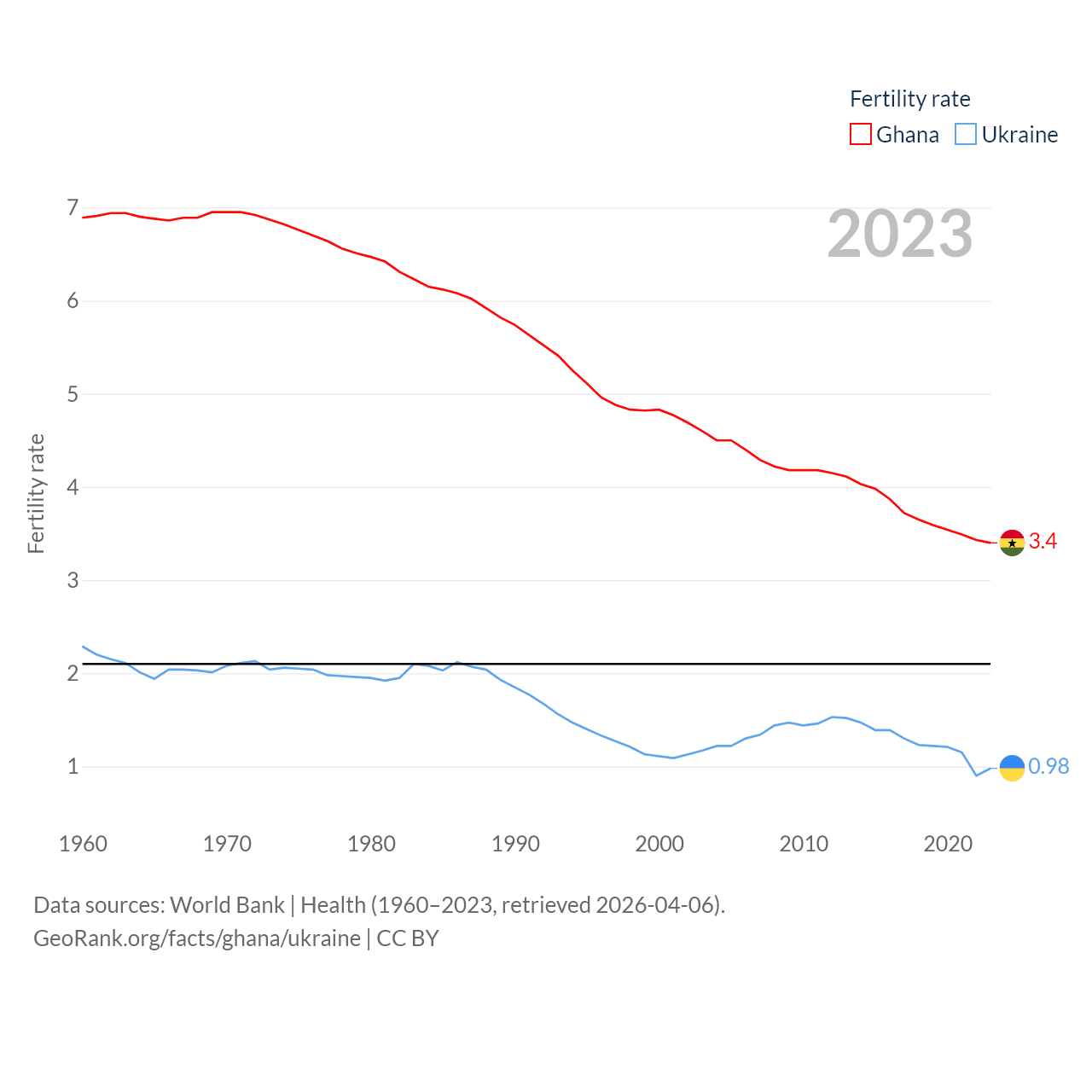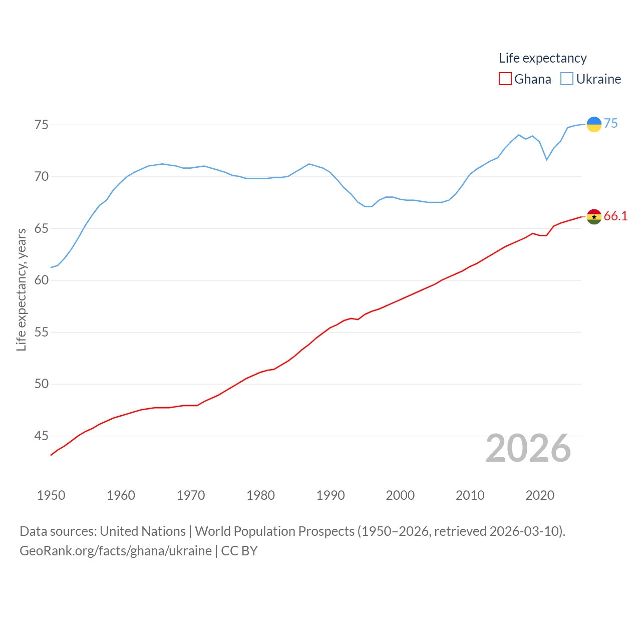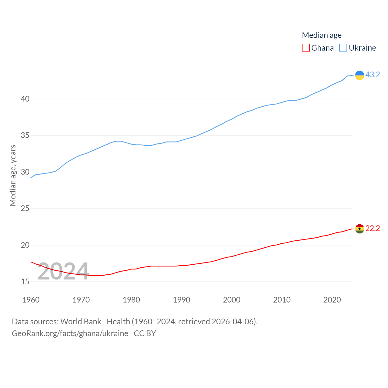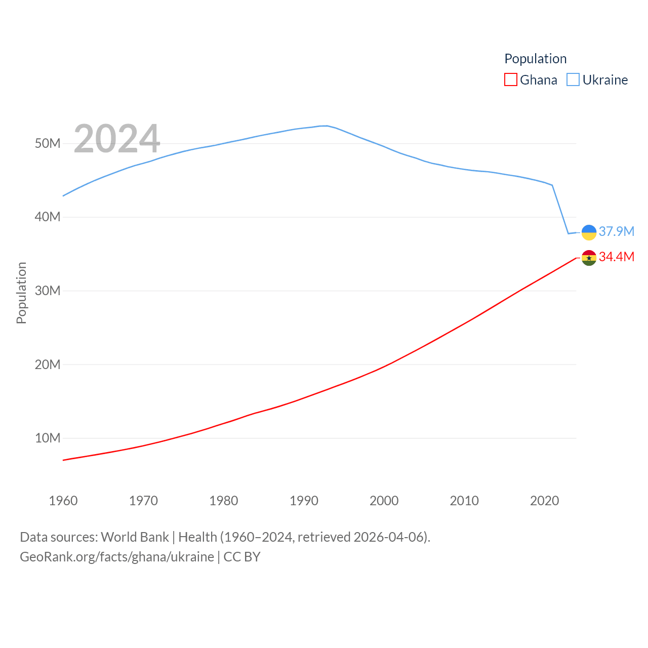 Ghana has a population of 34.4M (ranked 47/197), compared with 37.9M in Ukraine (ranked 41/197). Ghana's land area is 87,851 sq mi versus 223,708 sq mi for Ukraine (ranked 81st vs. 46th).
