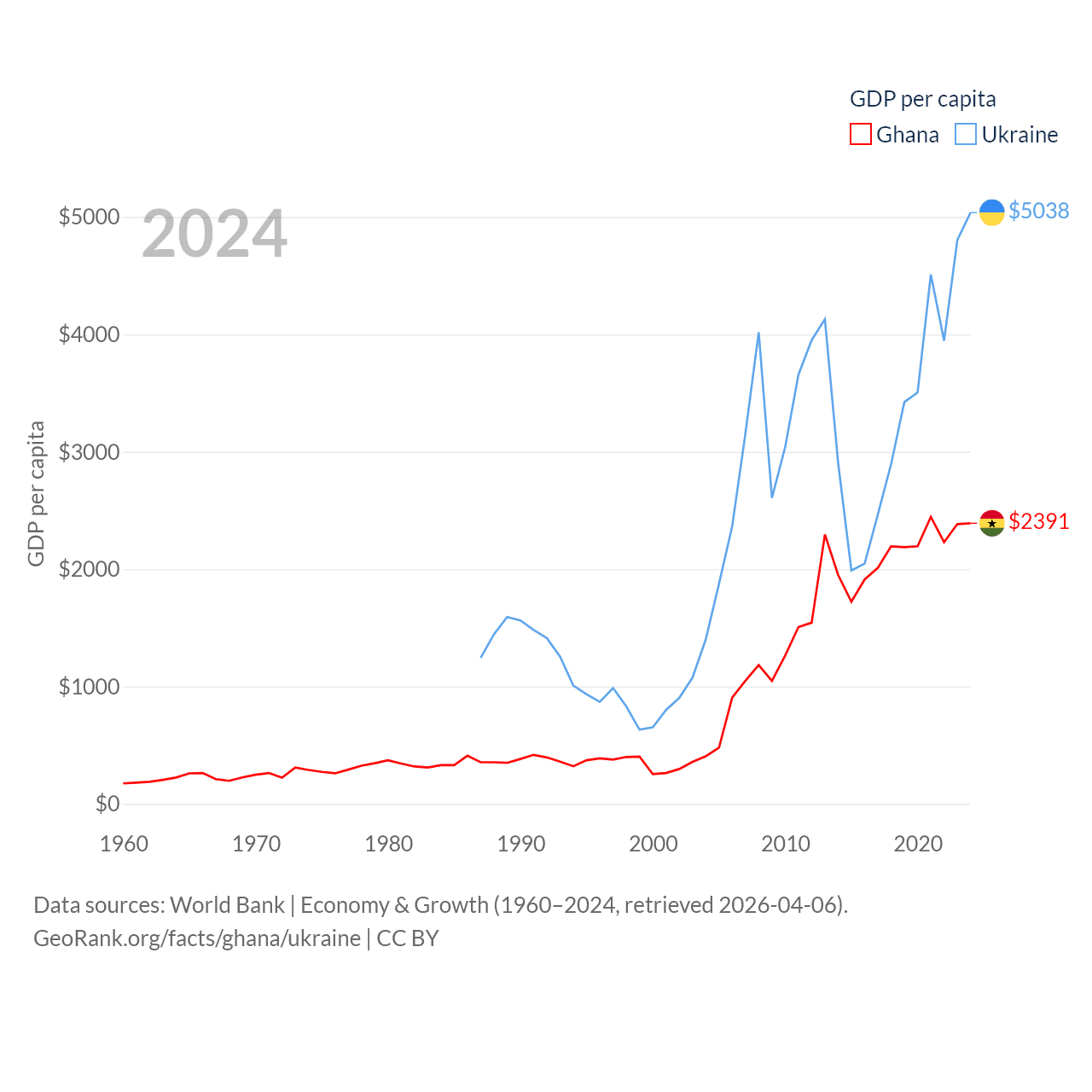 By GDP, Ghana ranks 80/197 ($82.3B) and Ukraine ranks 57/197 ($191B). By GDP per capita, Ghana ranks 151/197 ($2,391), while Ukraine ranks 120/197 ($5,038).