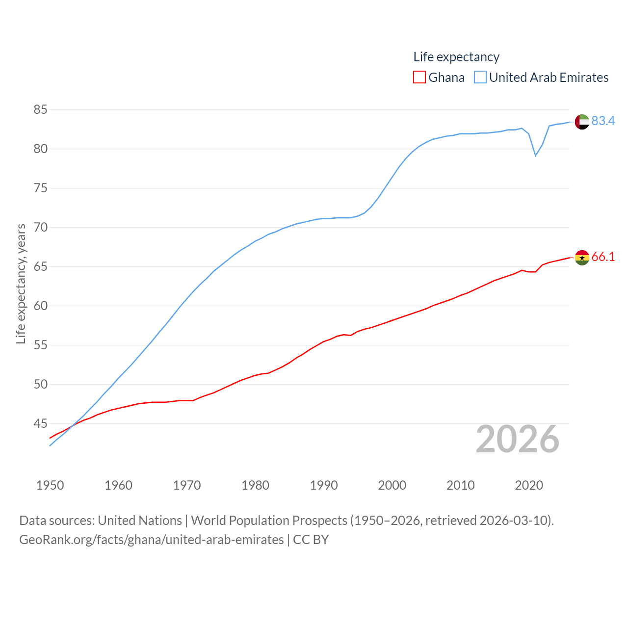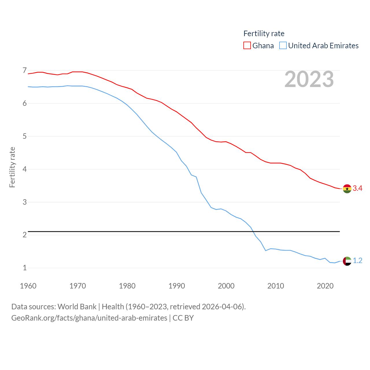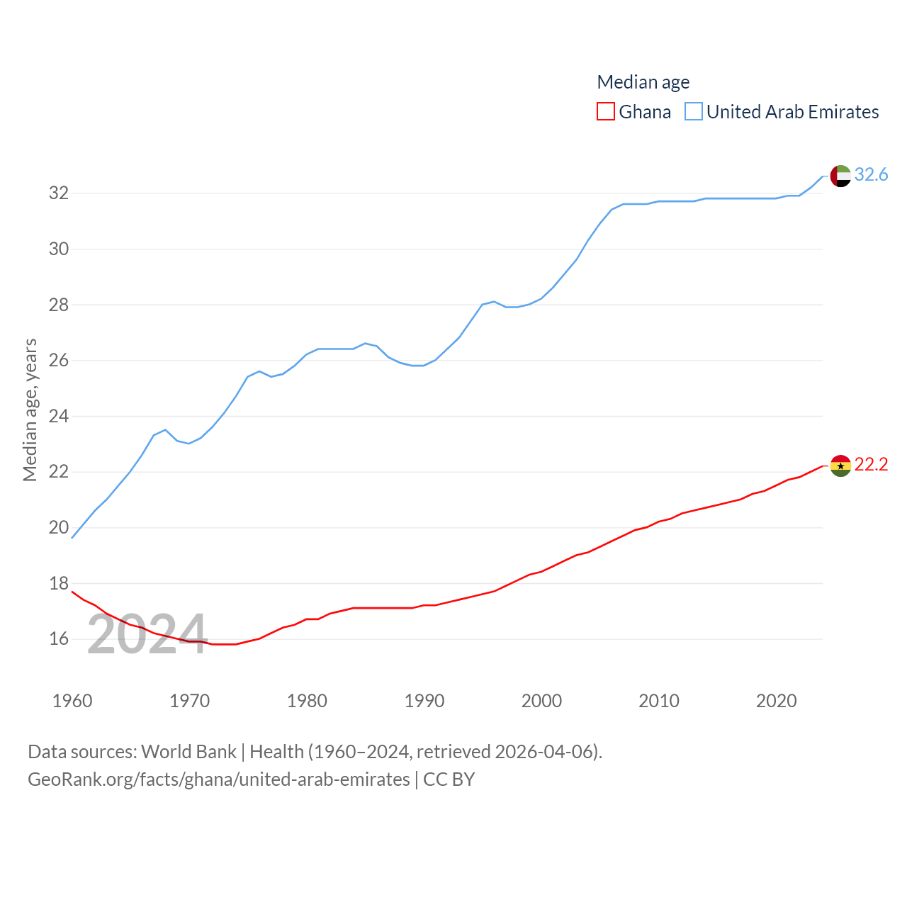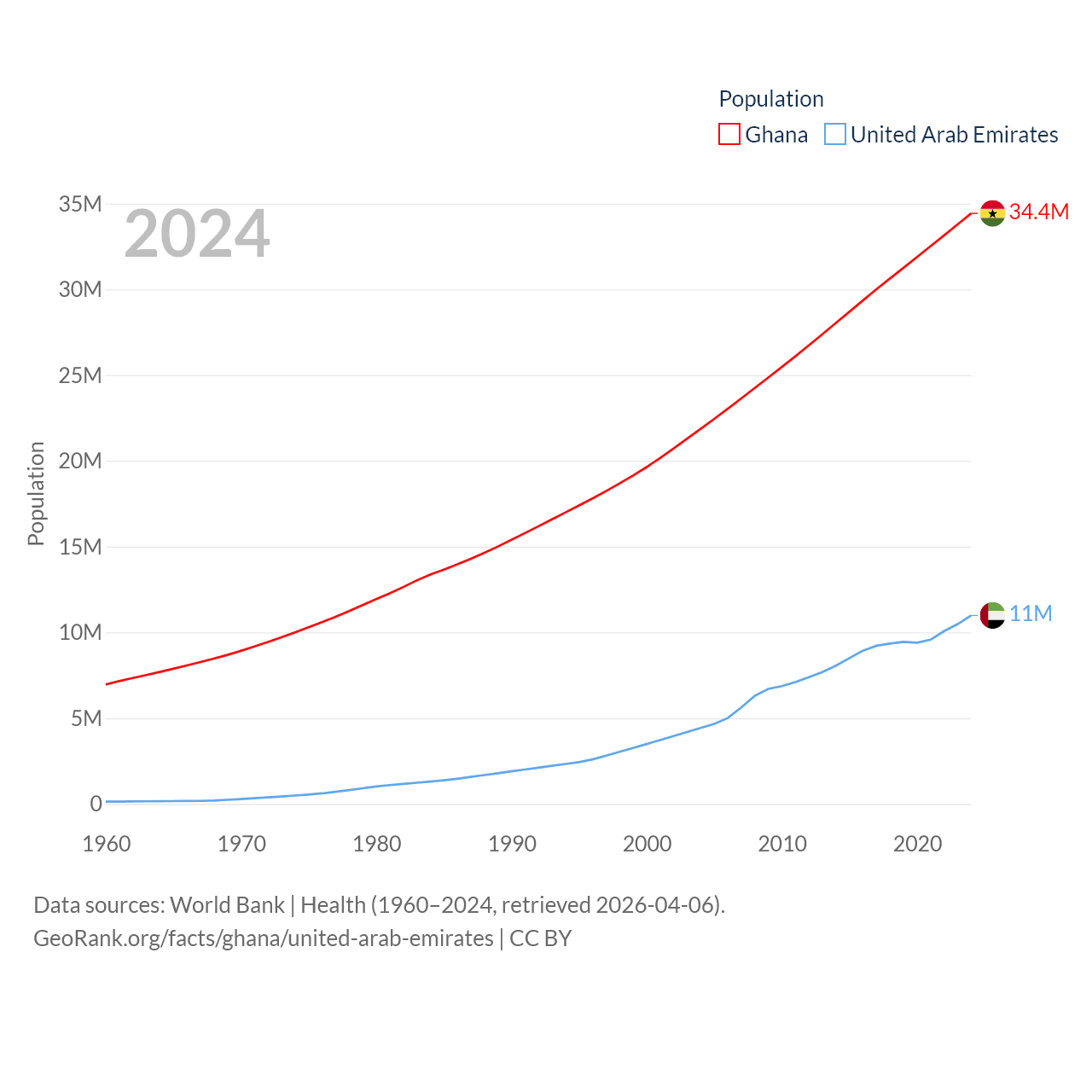 Ghana has a population of 34.4M (ranked 47/197), compared with 11M in The United Arab Emirates (ranked 86/197). Ghana's land area is 87,851 sq mi versus 27,421 sq mi for The United Arab Emirates (ranked 81st vs. 117th).