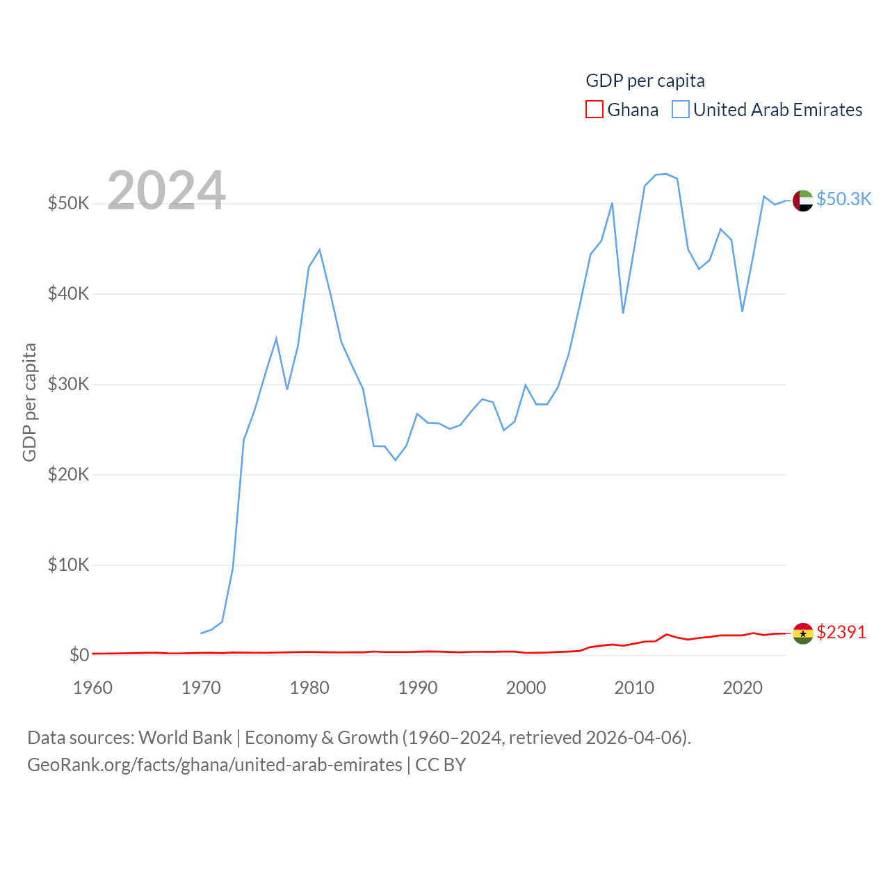 By GDP, Ghana ranks 80/197 ($82.3B) and The United Arab Emirates ranks 27/197 ($552B). By GDP per capita, Ghana ranks 151/197 ($2,391), while The United Arab Emirates ranks 24/197 ($50,274).