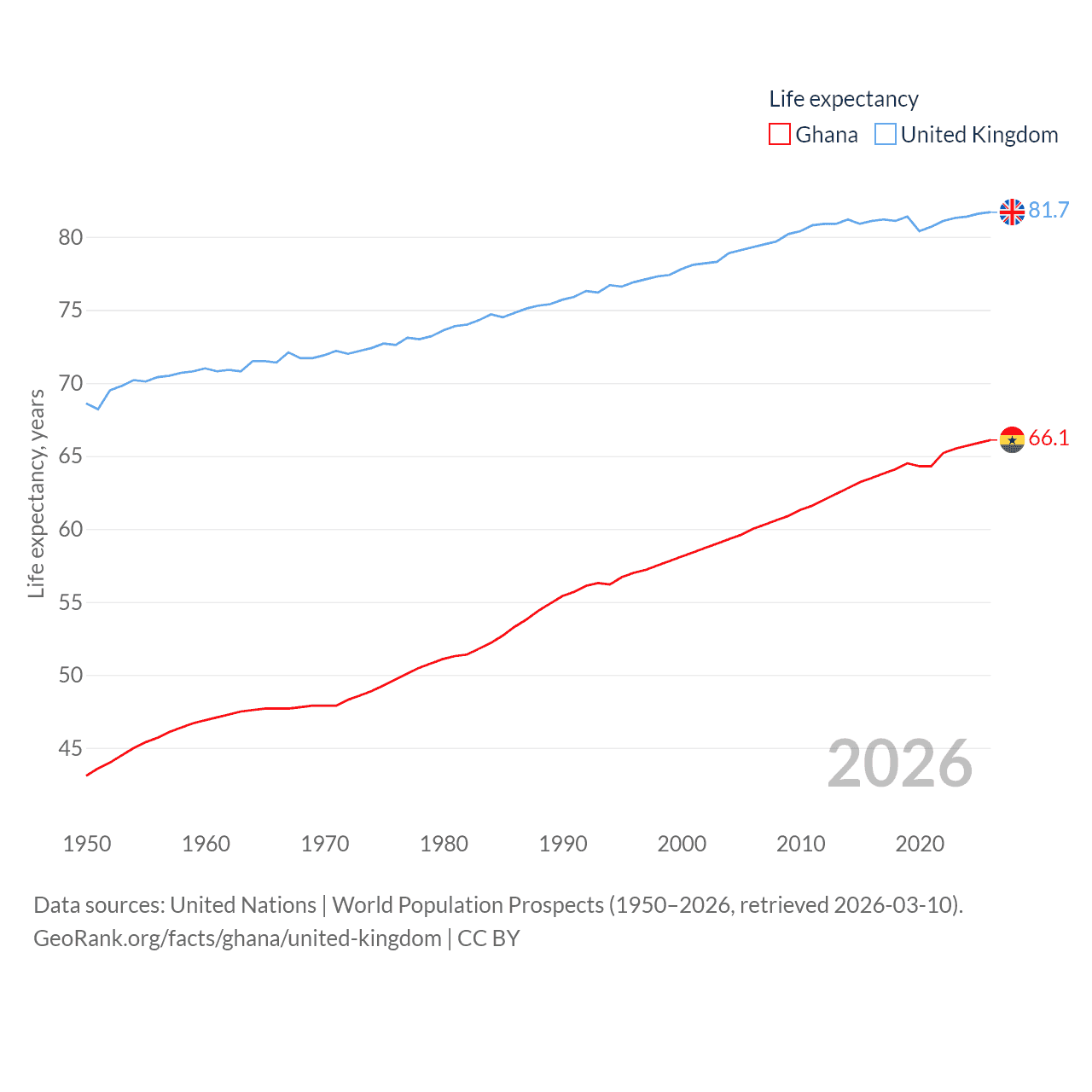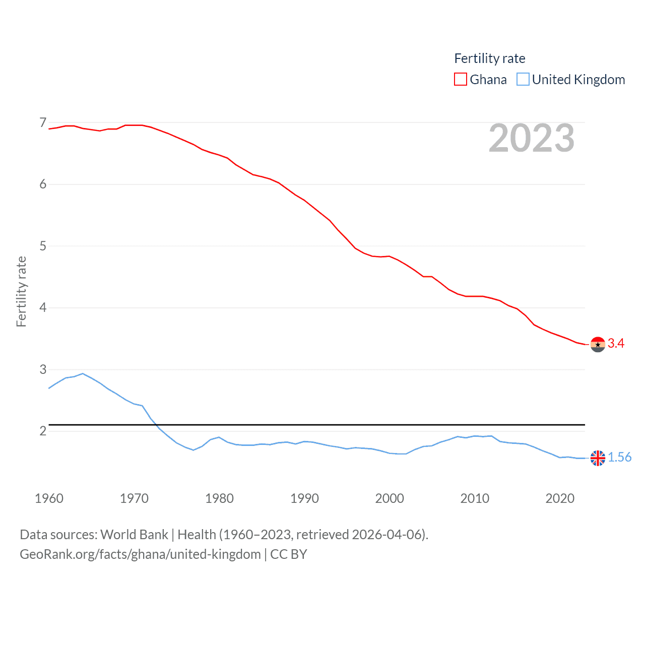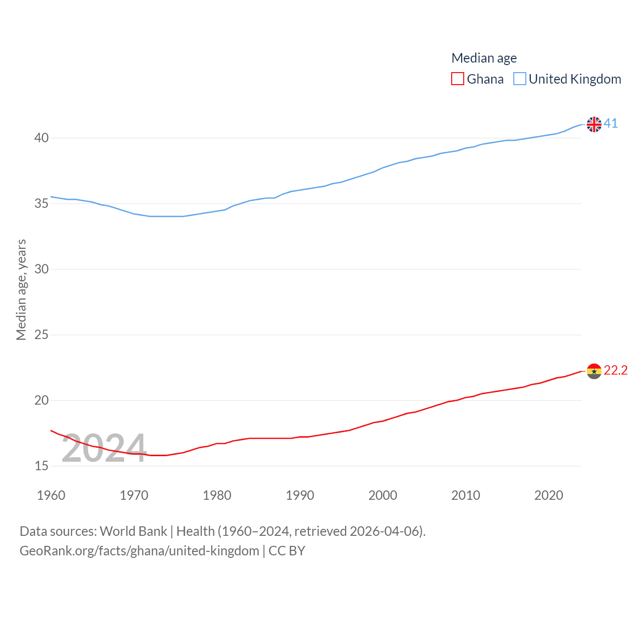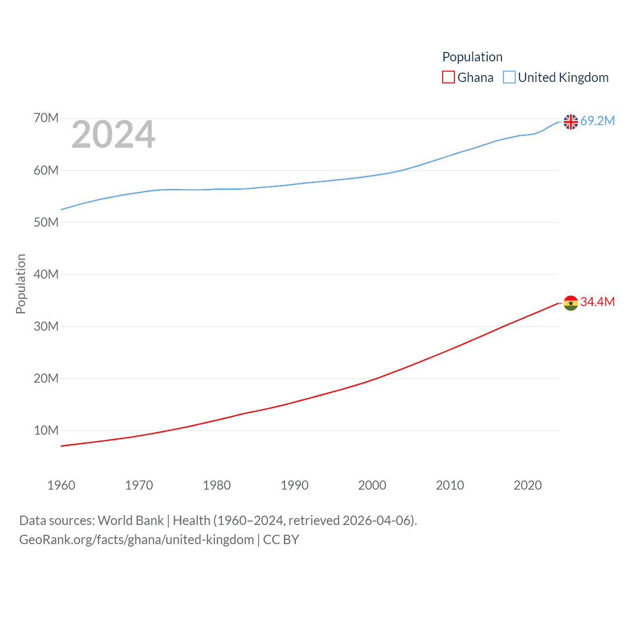 Ghana has a population of 34.4M (ranked 47/197), compared with 69.2M in The United Kingdom (ranked 21/197). Ghana's land area is 87,851 sq mi versus 93,410 sq mi for The United Kingdom (ranked 81st vs. 78th).