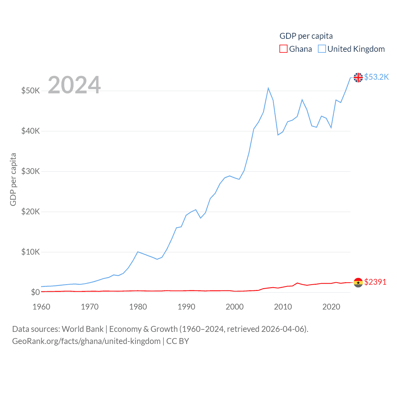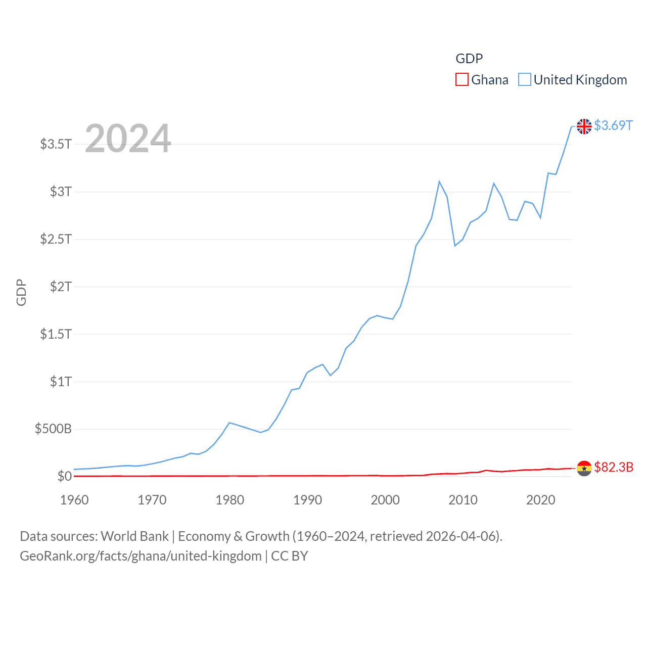 By GDP, Ghana ranks 80/197 ($82.3B) and The United Kingdom ranks 6/197 ($3.69T). By GDP per capita, Ghana ranks 151/197 ($2,391), while The United Kingdom ranks 22/197 ($53,246).