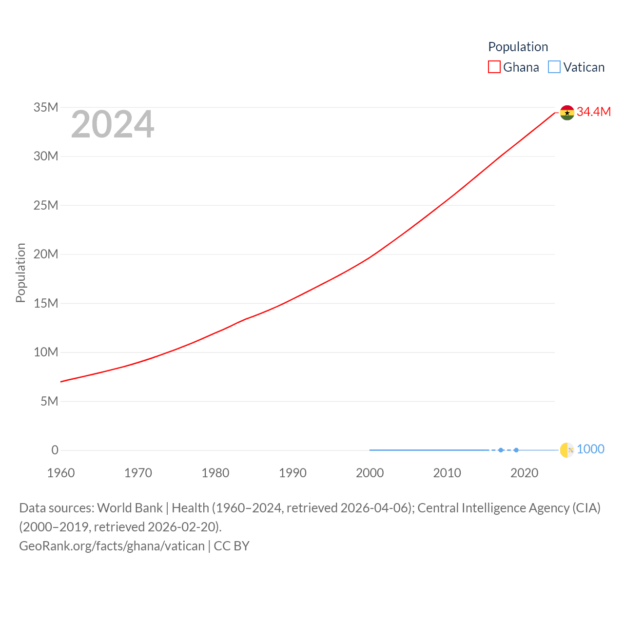Ghana has a population of 34.4M (ranked 47/197), compared with 1K in The Vatican (ranked 197/197). Ghana's land area is 87,851 sq mi versus 0.17 sq mi for The Vatican (ranked 81st vs. 197th).