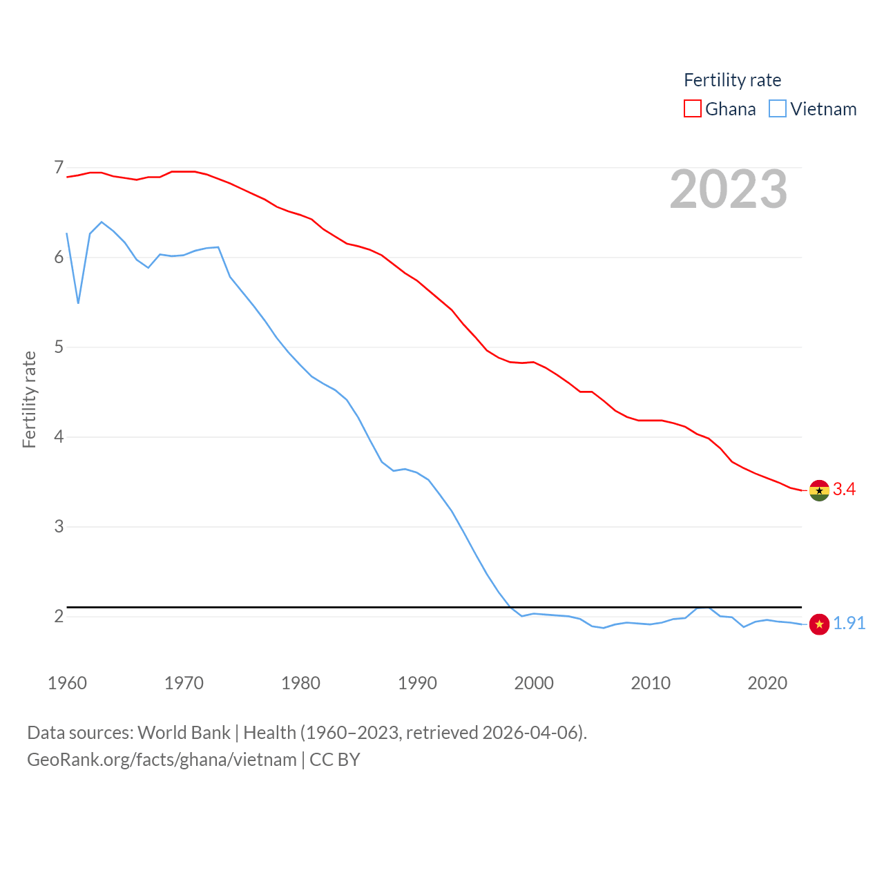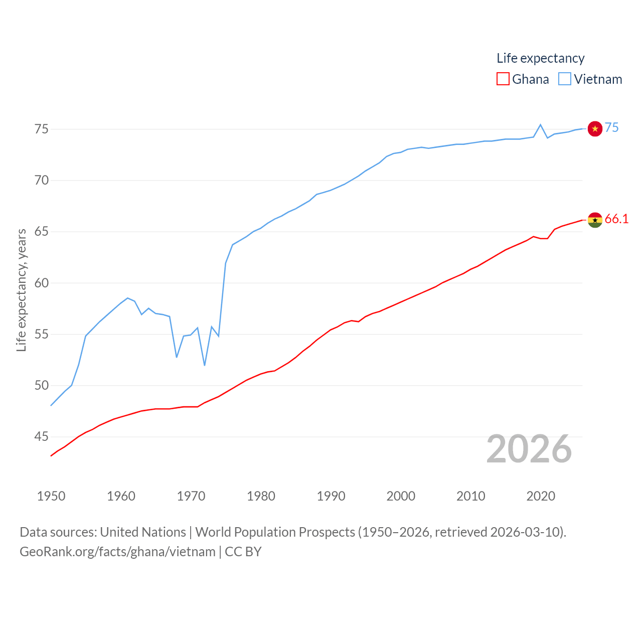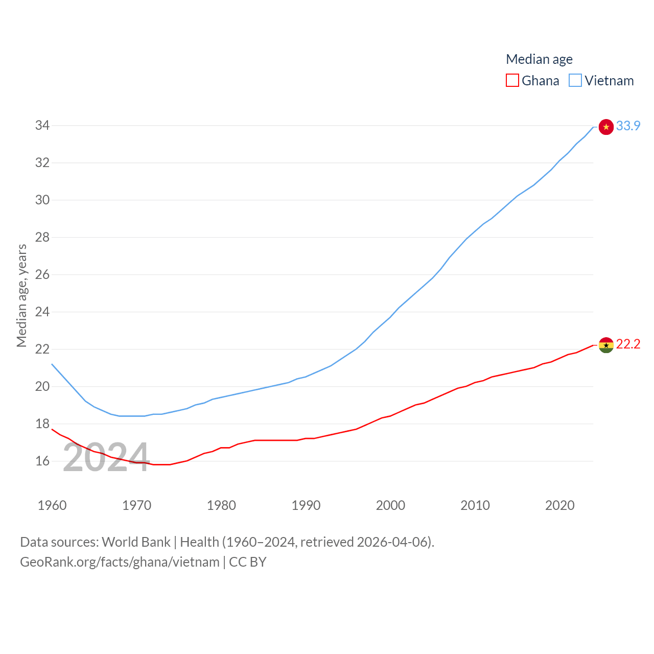 Ghana has a population of 34.4M (ranked 47/197), compared with 101M in Vietnam (ranked 16/197). Ghana's land area is 87,851 sq mi versus 121,016 sq mi for Vietnam (ranked 81st vs. 67th).