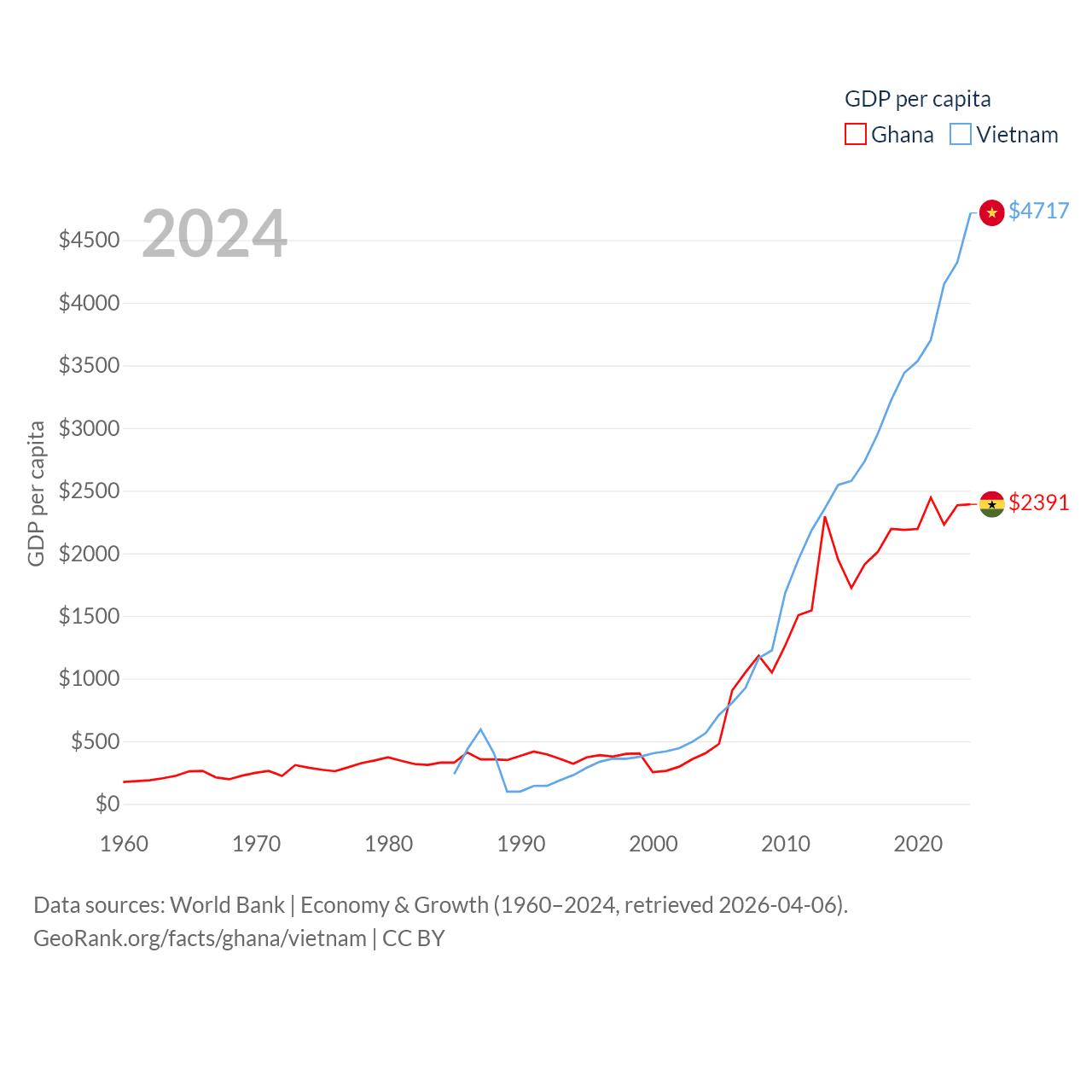 By GDP, Ghana ranks 80/197 ($82.3B) and Vietnam ranks 33/197 ($476B). By GDP per capita, Ghana ranks 151/197 ($2,391), while Vietnam ranks 122/197 ($4,717).