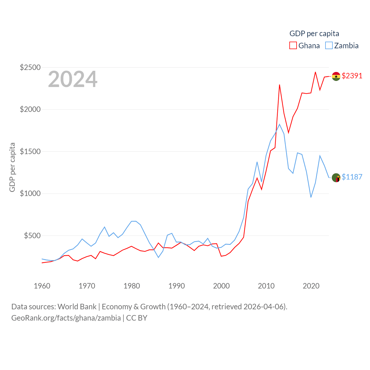By GDP, Ghana ranks 80/197 ($82.3B) and Zambia ranks 116/197 ($25.3B). By GDP per capita, Ghana ranks 151/197 ($2,391), while Zambia ranks 169/197 ($1,187).