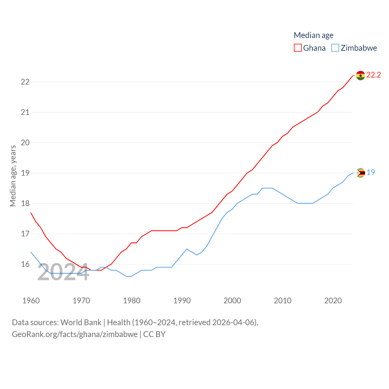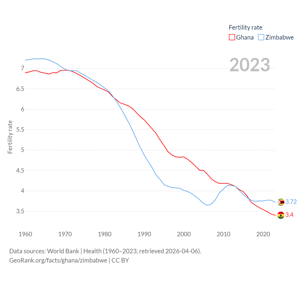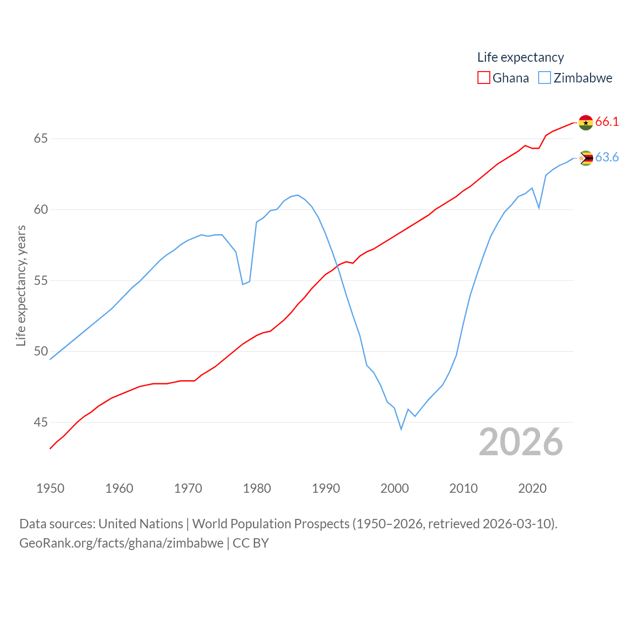 Ghana has a population of 34.4M (ranked 47/197), compared with 16.6M in Zimbabwe (ranked 74/197). Ghana's land area is 87,851 sq mi versus 149,364 sq mi for Zimbabwe (ranked 81st vs. 60th).