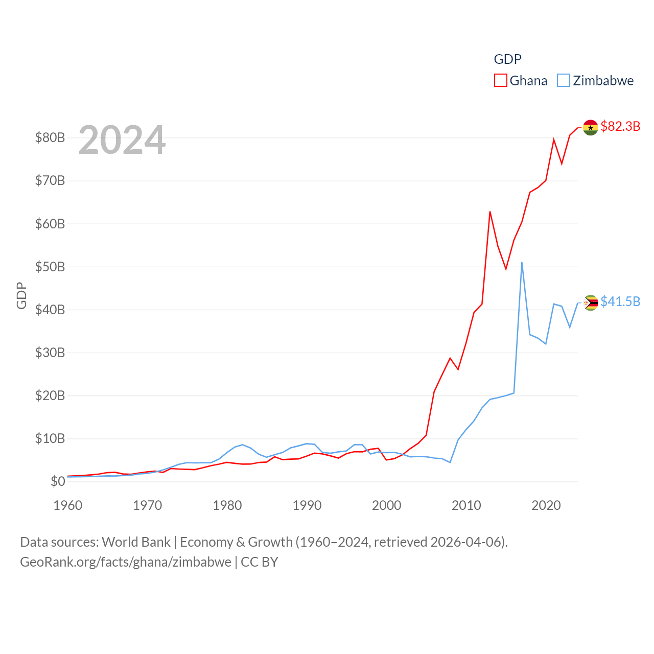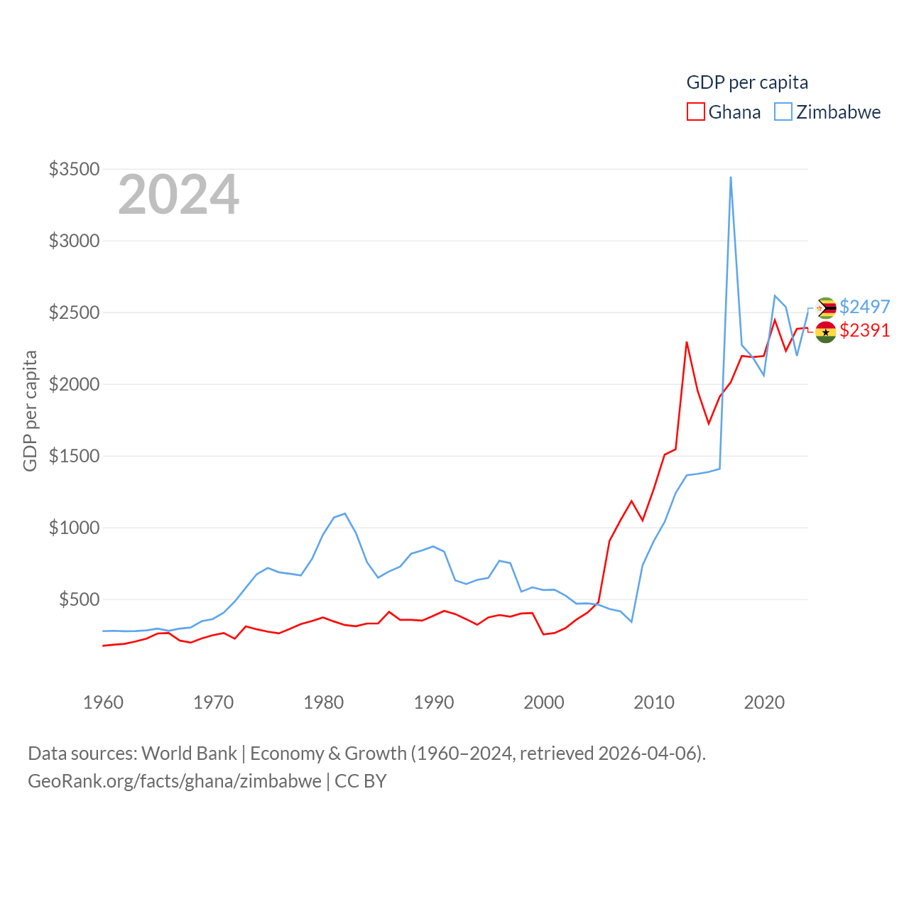 By GDP, Ghana ranks 80/197 ($82.3B) and Zimbabwe ranks 102/197 ($41.5B). By GDP per capita, Ghana ranks 151/197 ($2,391), while Zimbabwe ranks 148/197 ($2,497).