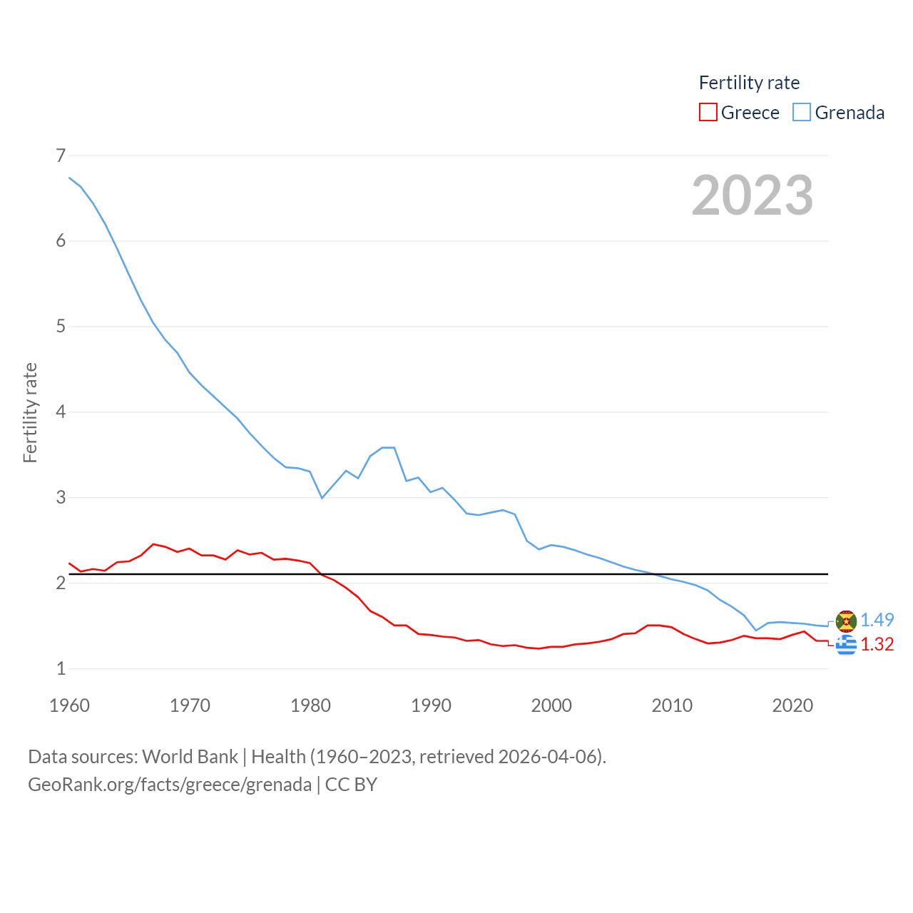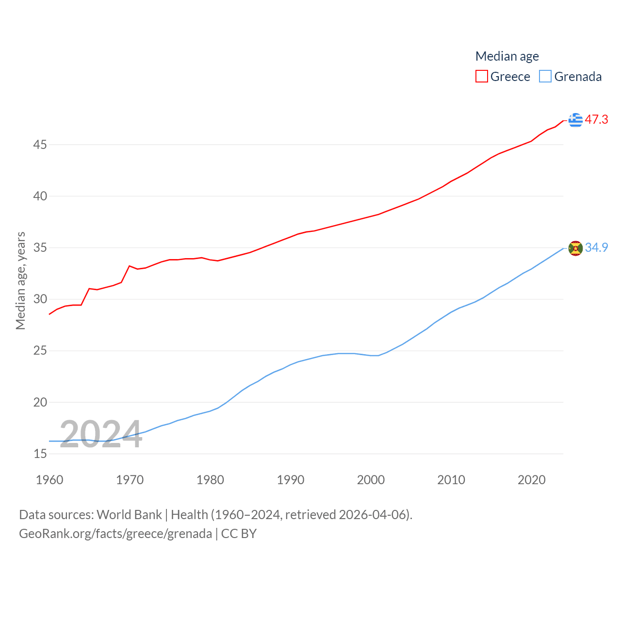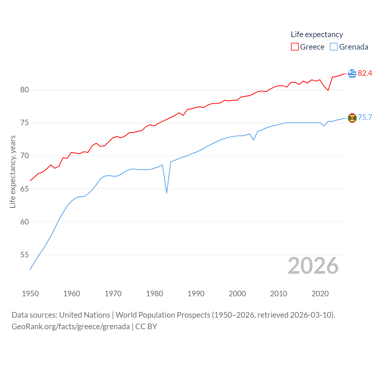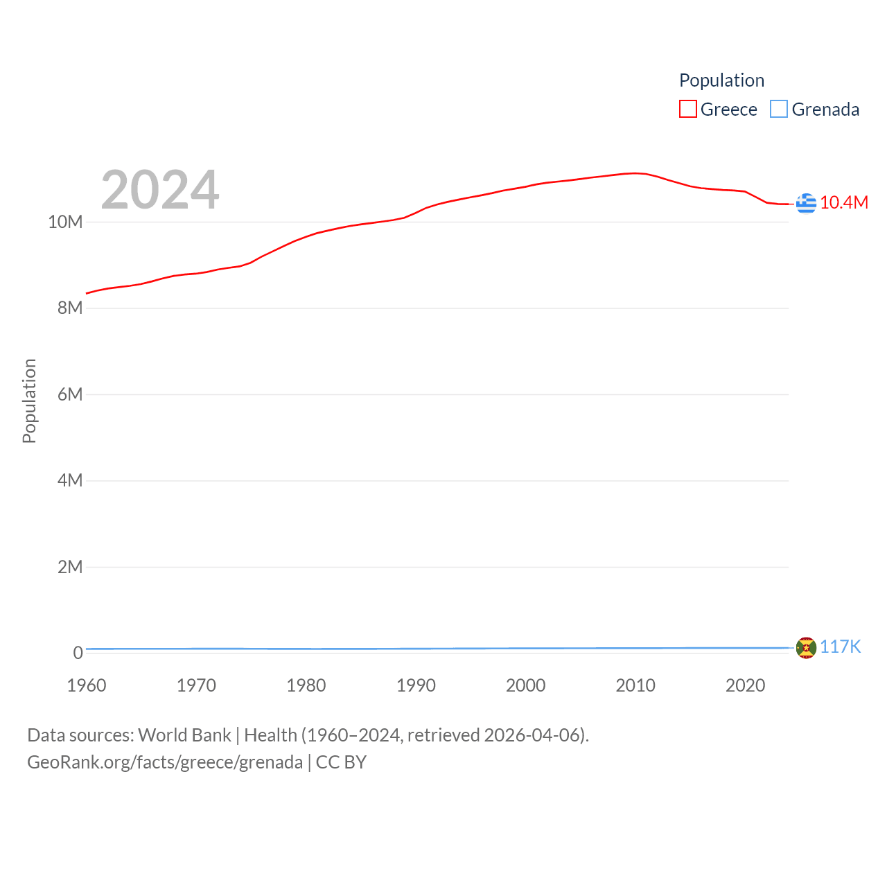 Greece has a population of 10.4M (ranked 94/197), compared with 117K in Grenada (ranked 182/197). Greece's land area is 49,769 sq mi versus 131.3 sq mi for Grenada (ranked 95th vs. 186th).