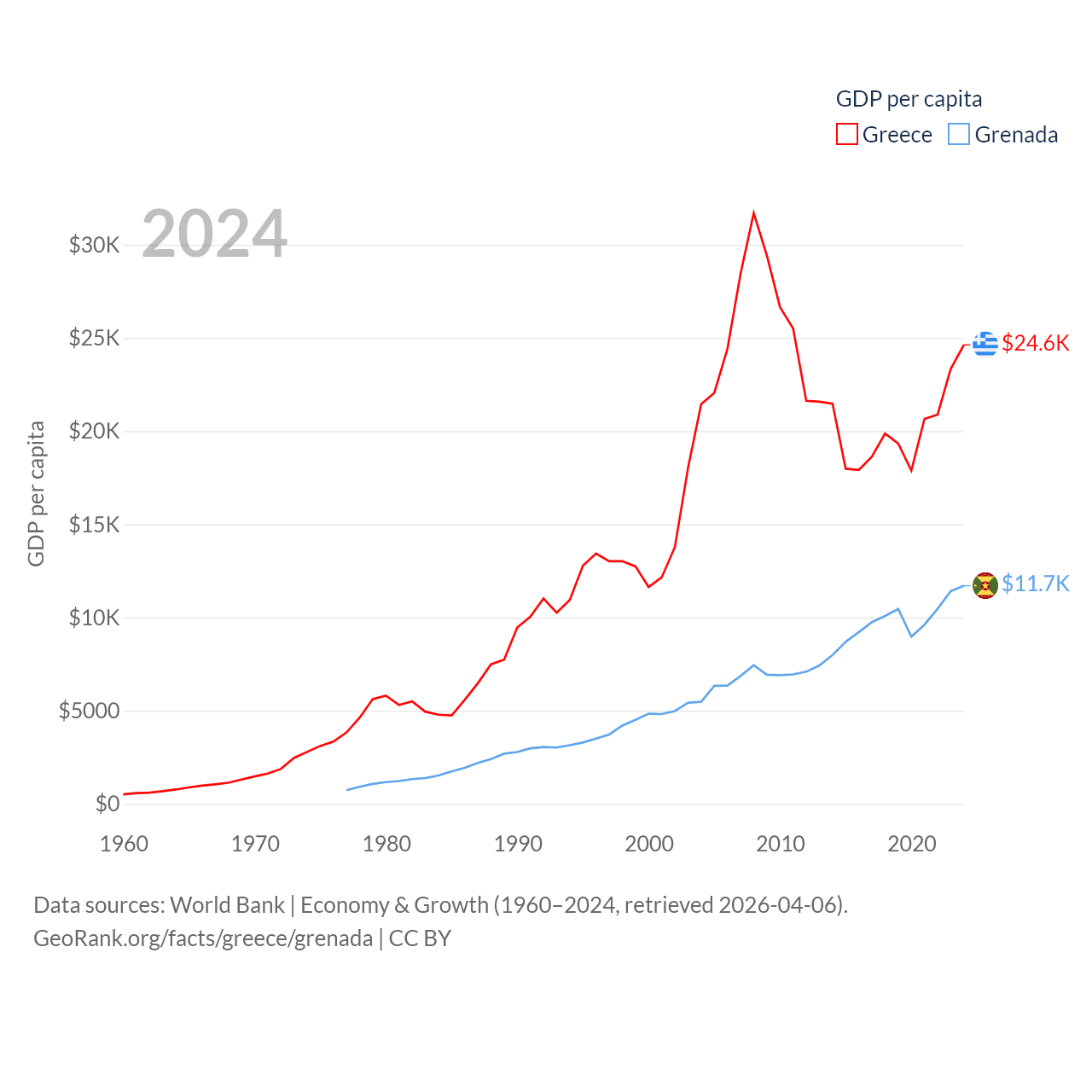 By GDP, Greece ranks 53/197 ($256B) and Grenada ranks 184/197 ($1.37B). By GDP per capita, Greece ranks 49/197 ($24,626), while Grenada ranks 80/197 ($11,705).