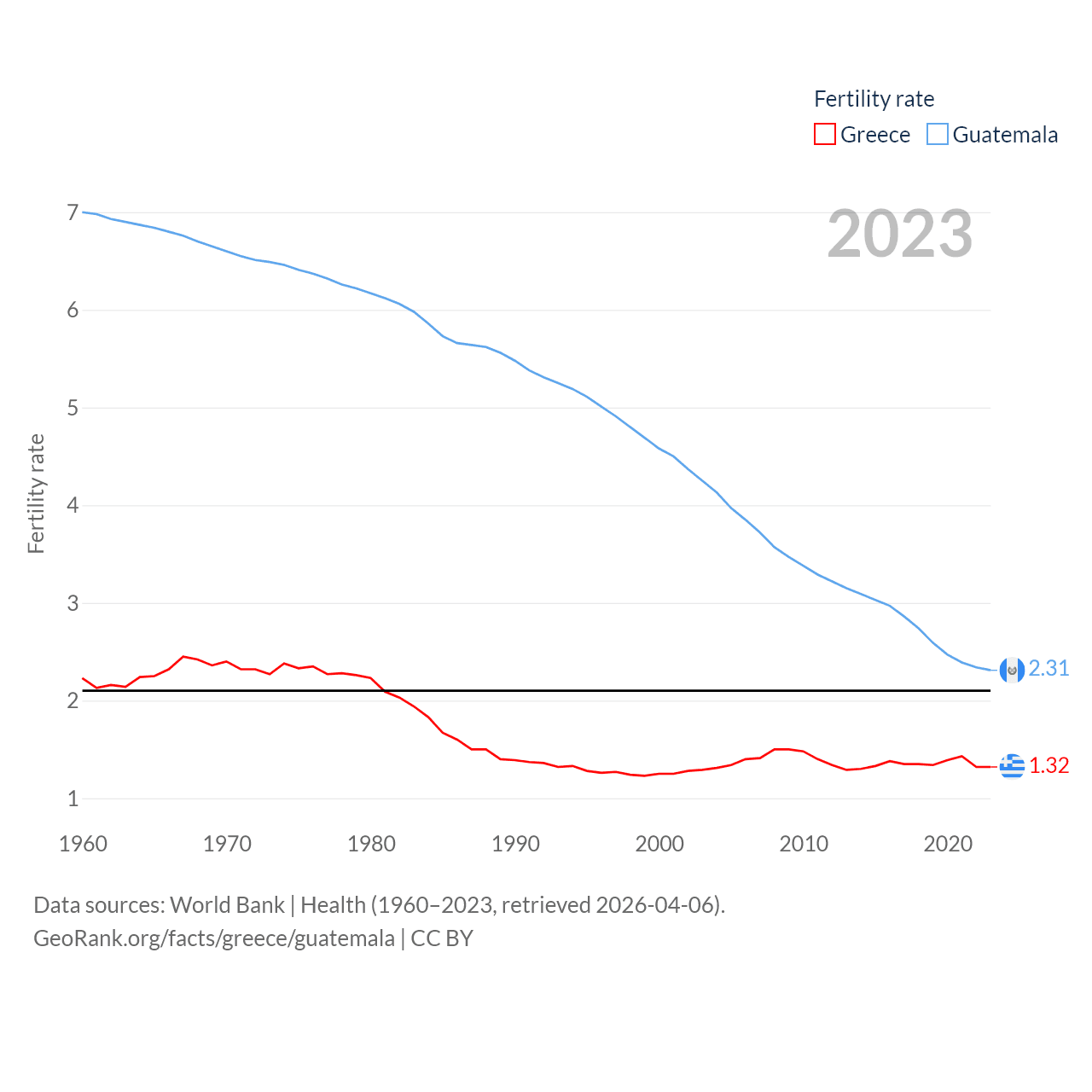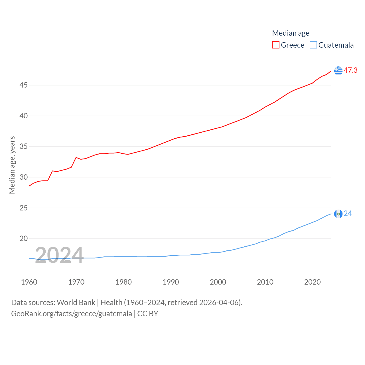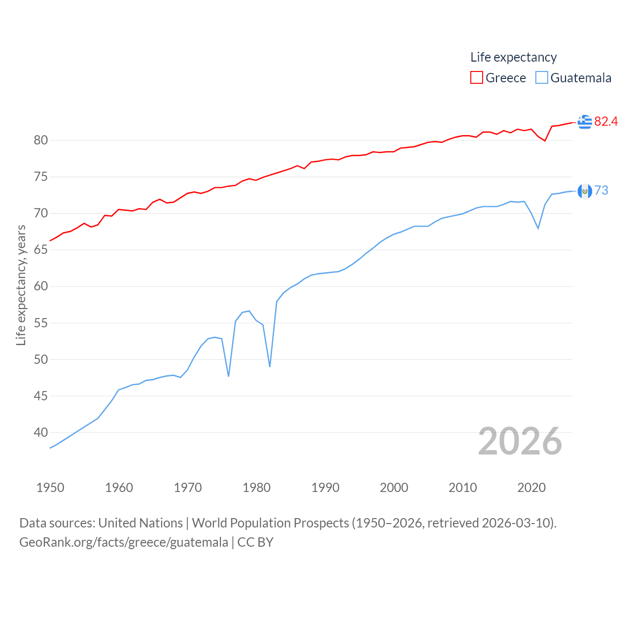 Greece has a population of 10.4M (ranked 94/197), compared with 18.4M in Guatemala (ranked 70/197). Greece's land area is 49,769 sq mi versus 41,375 sq mi for Guatemala (ranked 95th vs. 102nd).
