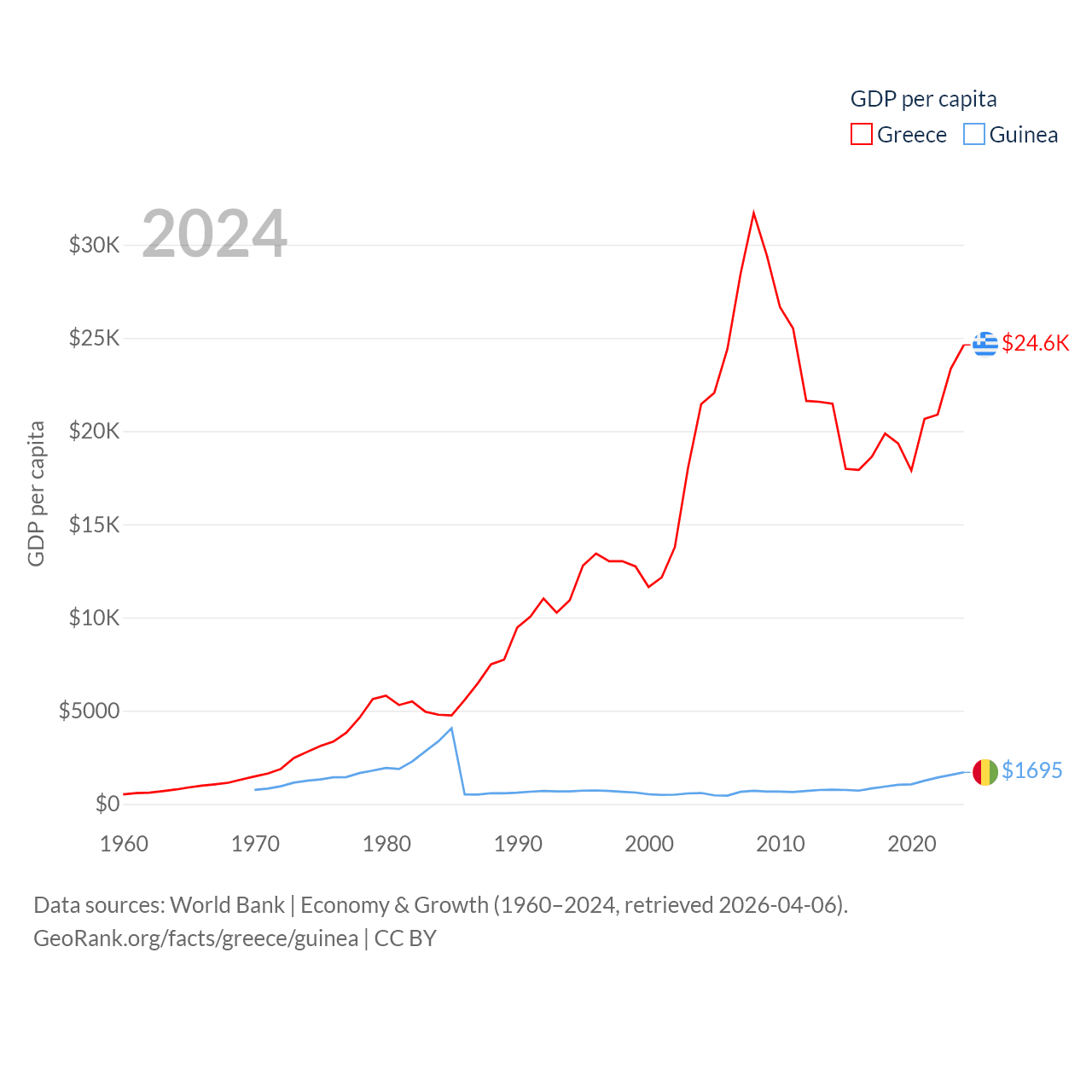 By GDP, Greece ranks 53/197 ($256B) and Guinea ranks 118/197 ($25B). By GDP per capita, Greece ranks 49/197 ($24,626), while Guinea ranks 160/197 ($1,695).