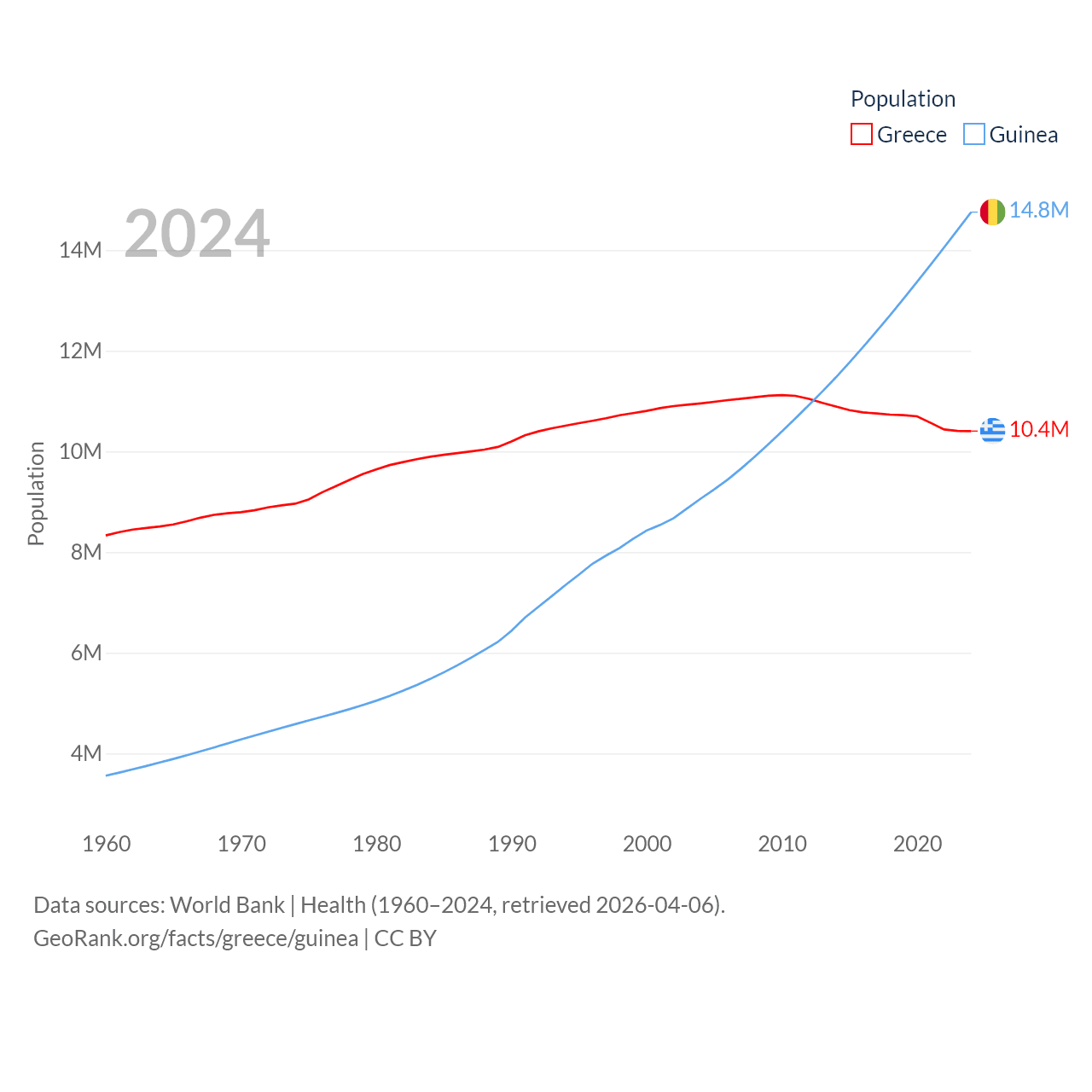 Greece has a population of 10.4M (ranked 94/197), compared with 14.8M in Guinea (ranked 75/197). Greece's land area is 49,769 sq mi versus 94,873 sq mi for Guinea (ranked 95th vs. 77th).
