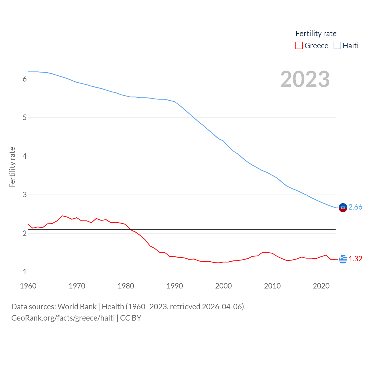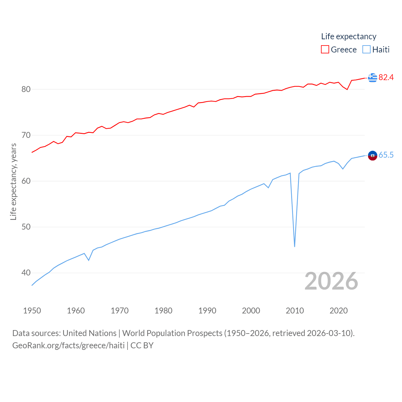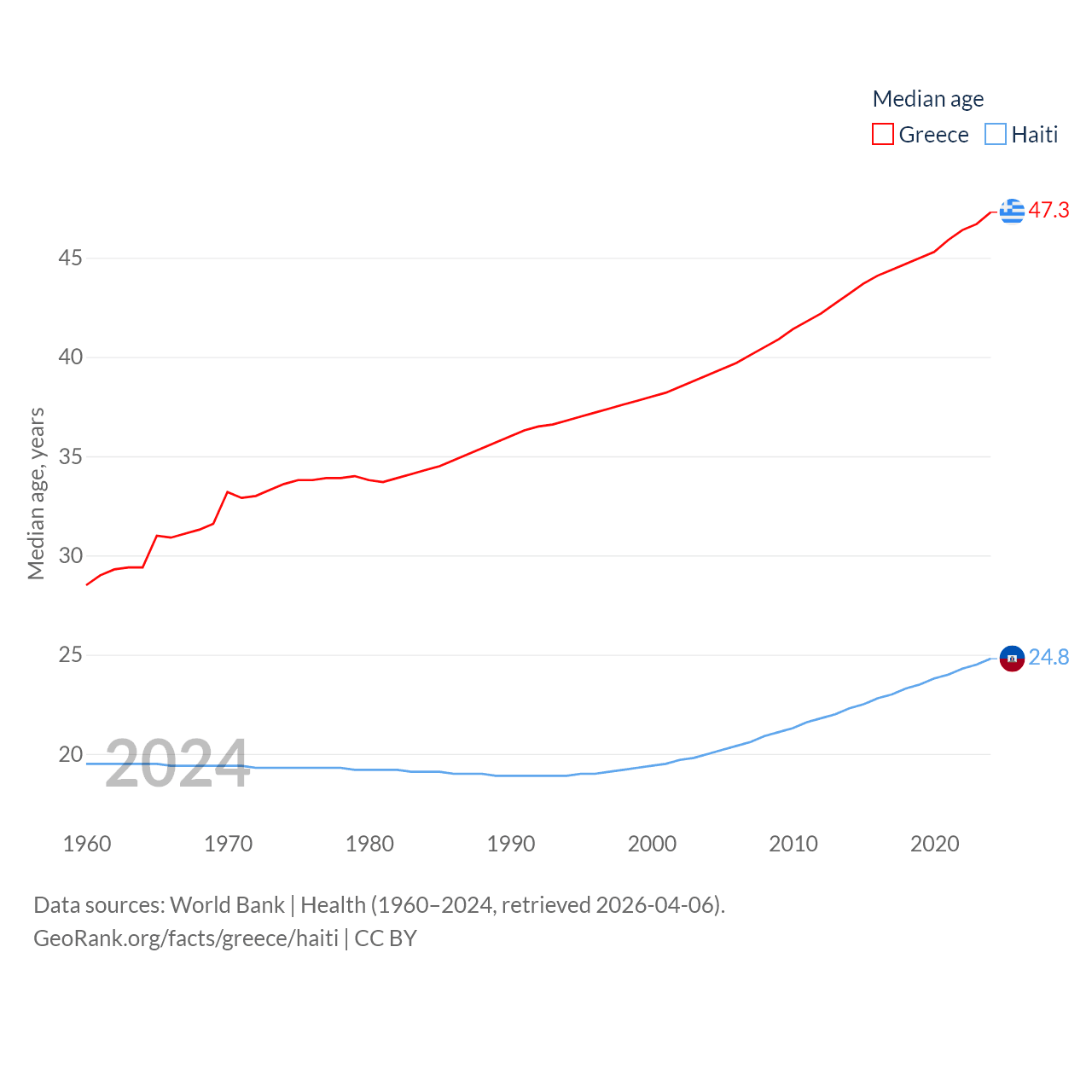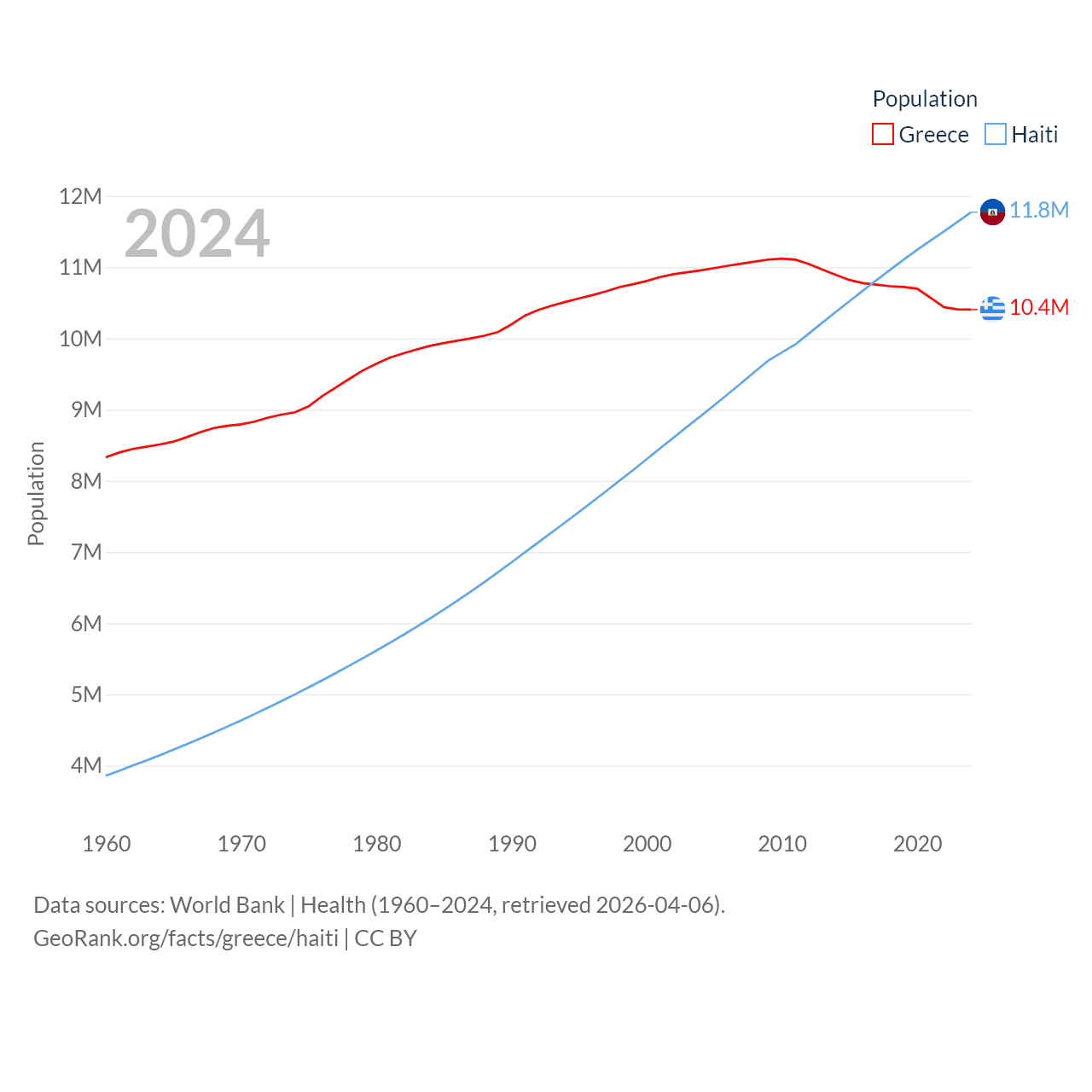 Greece has a population of 10.4M (ranked 94/197), compared with 11.8M in Haiti (ranked 83/197). Greece's land area is 49,769 sq mi versus 10,641 sq mi for Haiti (ranked 95th vs. 142nd).