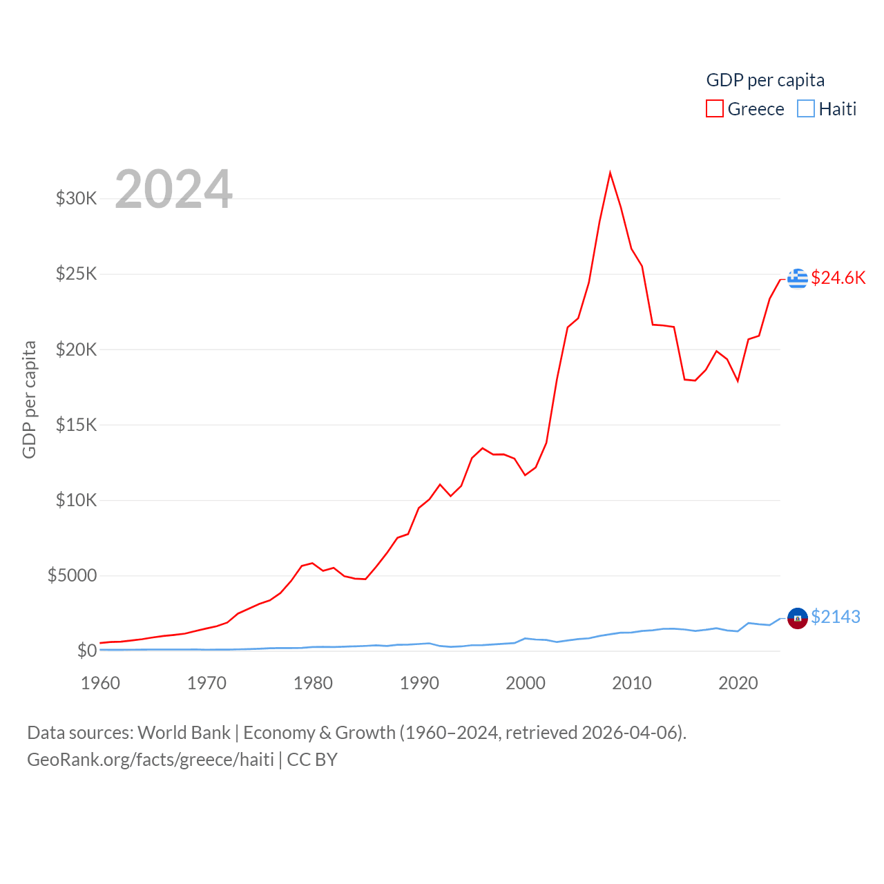 By GDP, Greece ranks 53/197 ($256B) and Haiti ranks 117/197 ($25.2B). By GDP per capita, Greece ranks 49/197 ($24,626), while Haiti ranks 153/197 ($2,143).