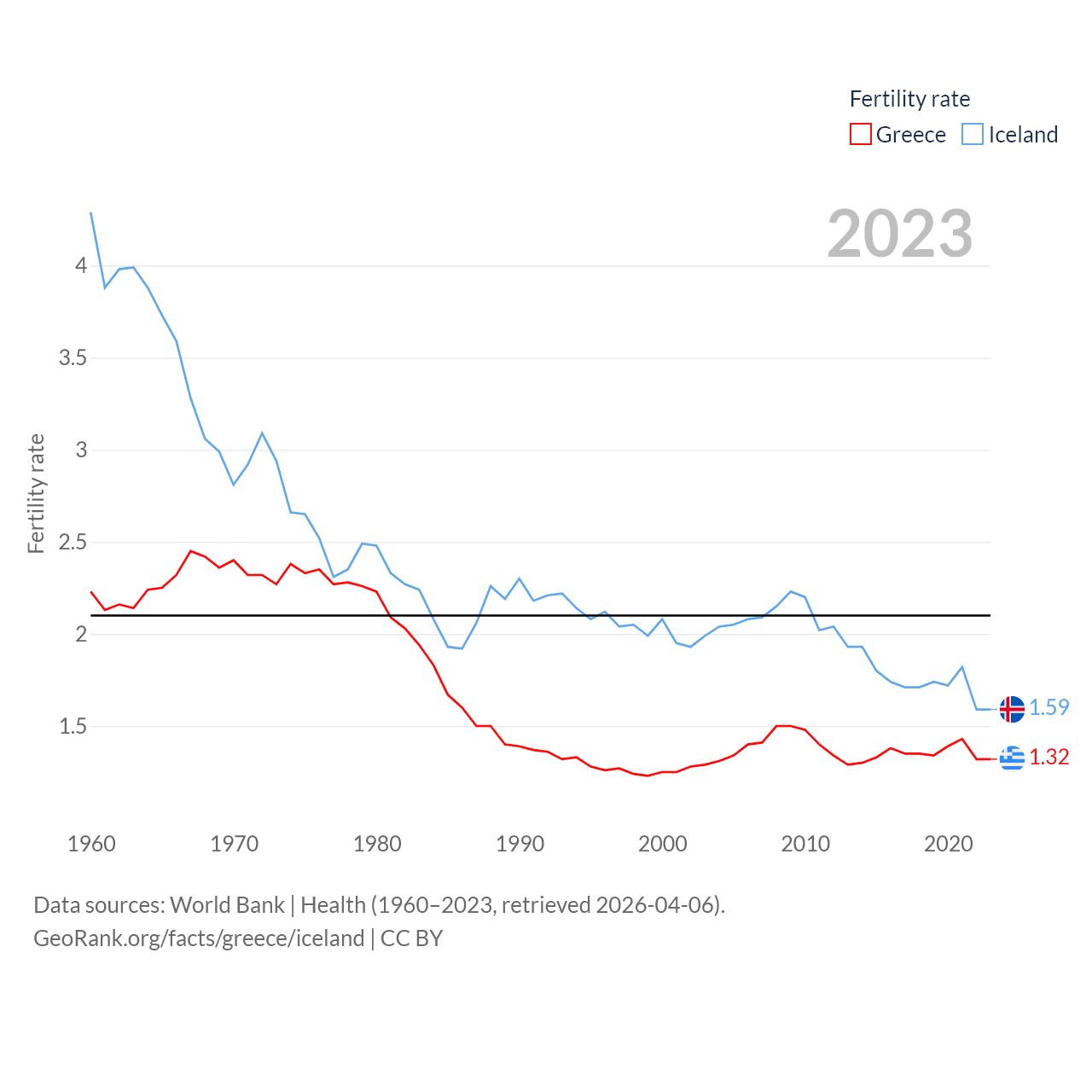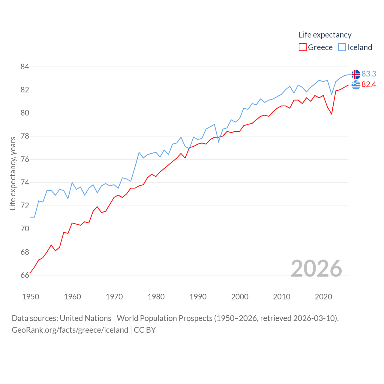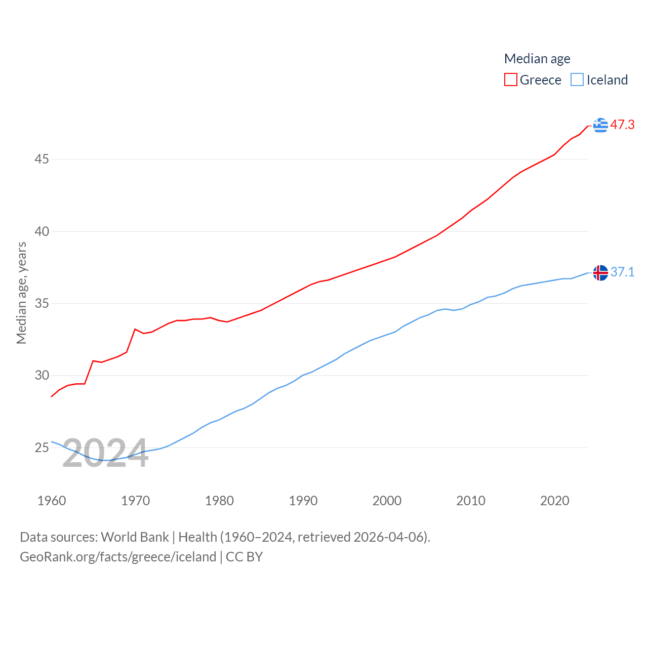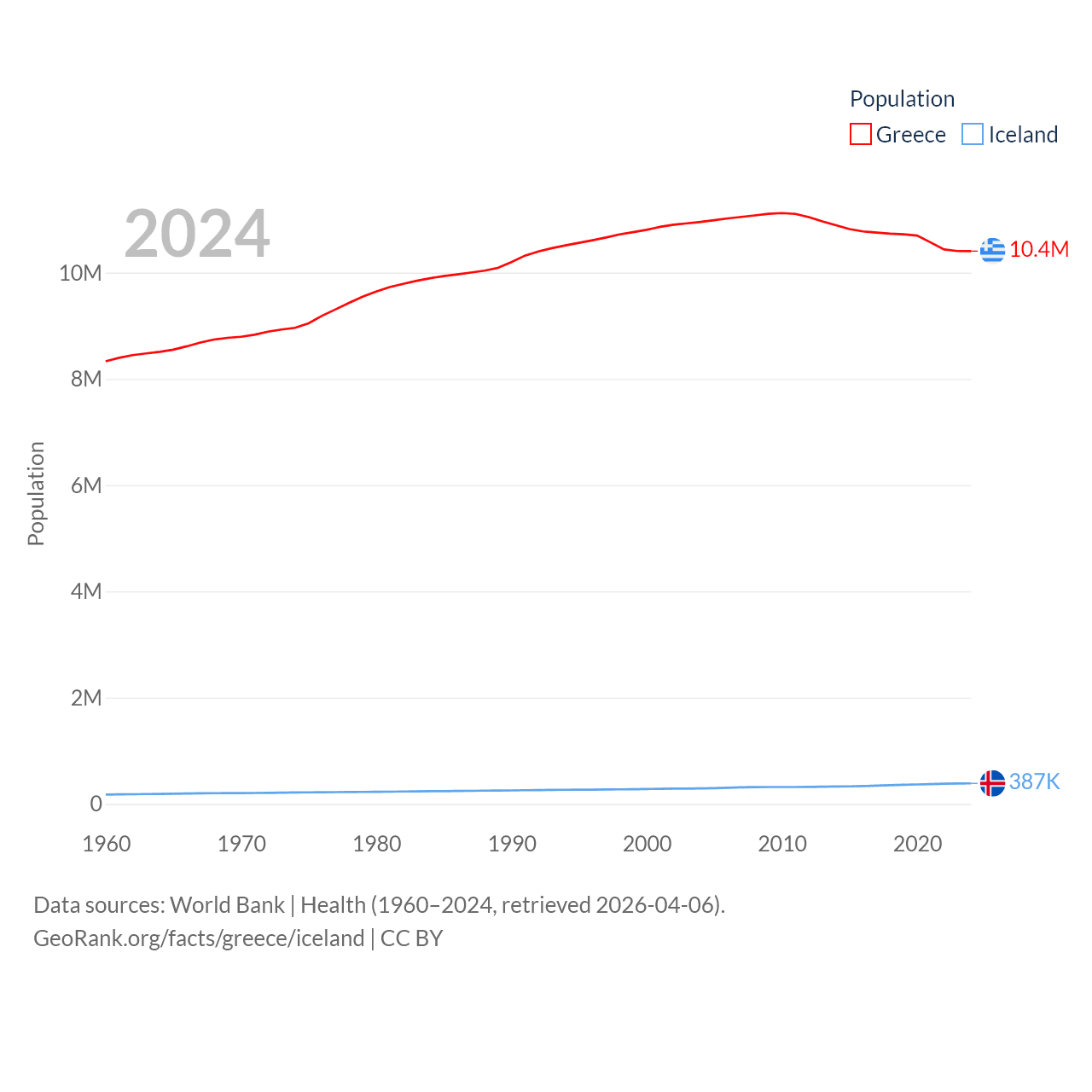 Greece has a population of 10.4M (ranked 94/197), compared with 387K in Iceland (ranked 173/197). Greece's land area is 49,769 sq mi versus 38,931 sq mi for Iceland (ranked 95th vs. 104th).