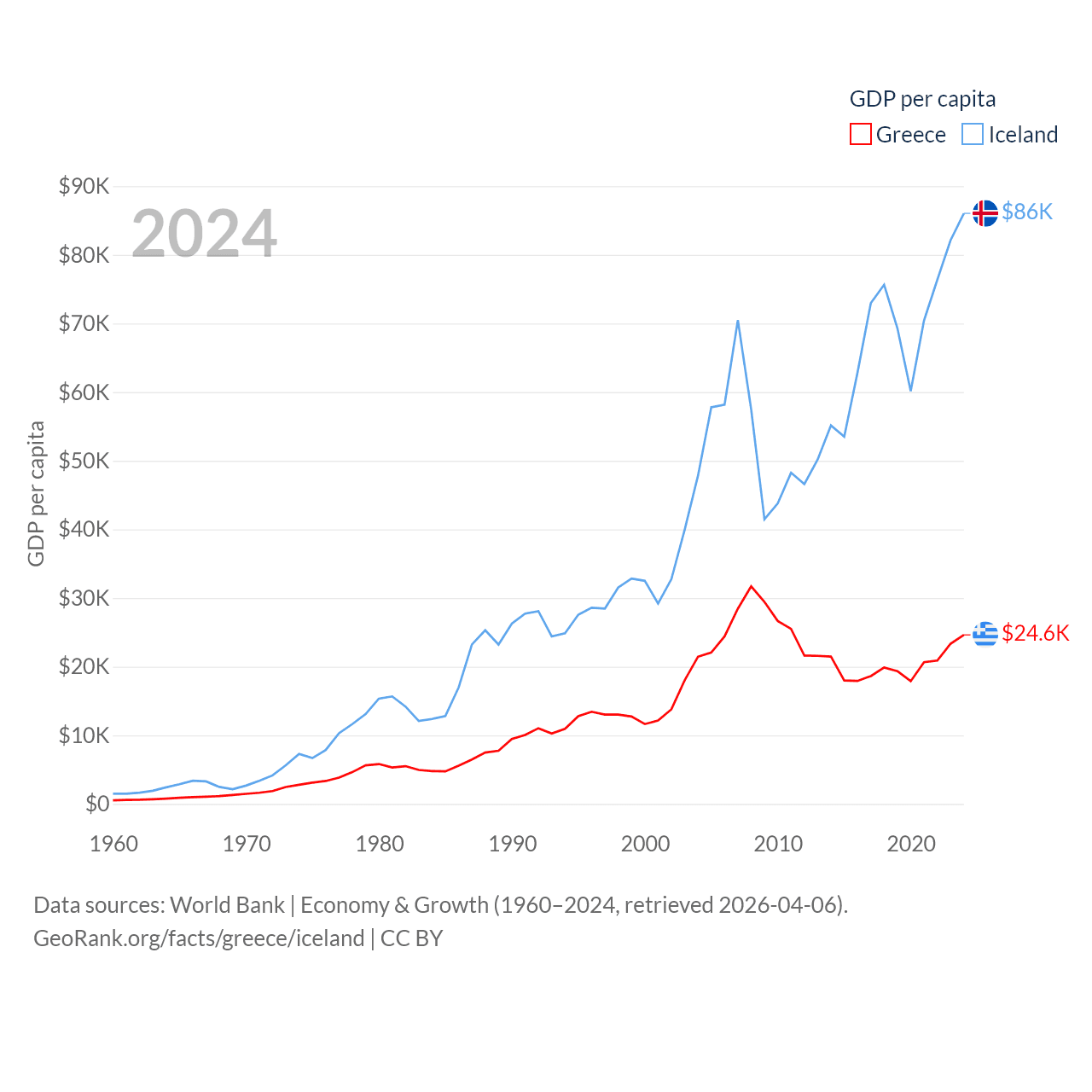 By GDP, Greece ranks 53/197 ($256B) and Iceland ranks 108/197 ($33.3B). By GDP per capita, Greece ranks 49/197 ($24,626), while Iceland ranks 9/197 ($86,041).