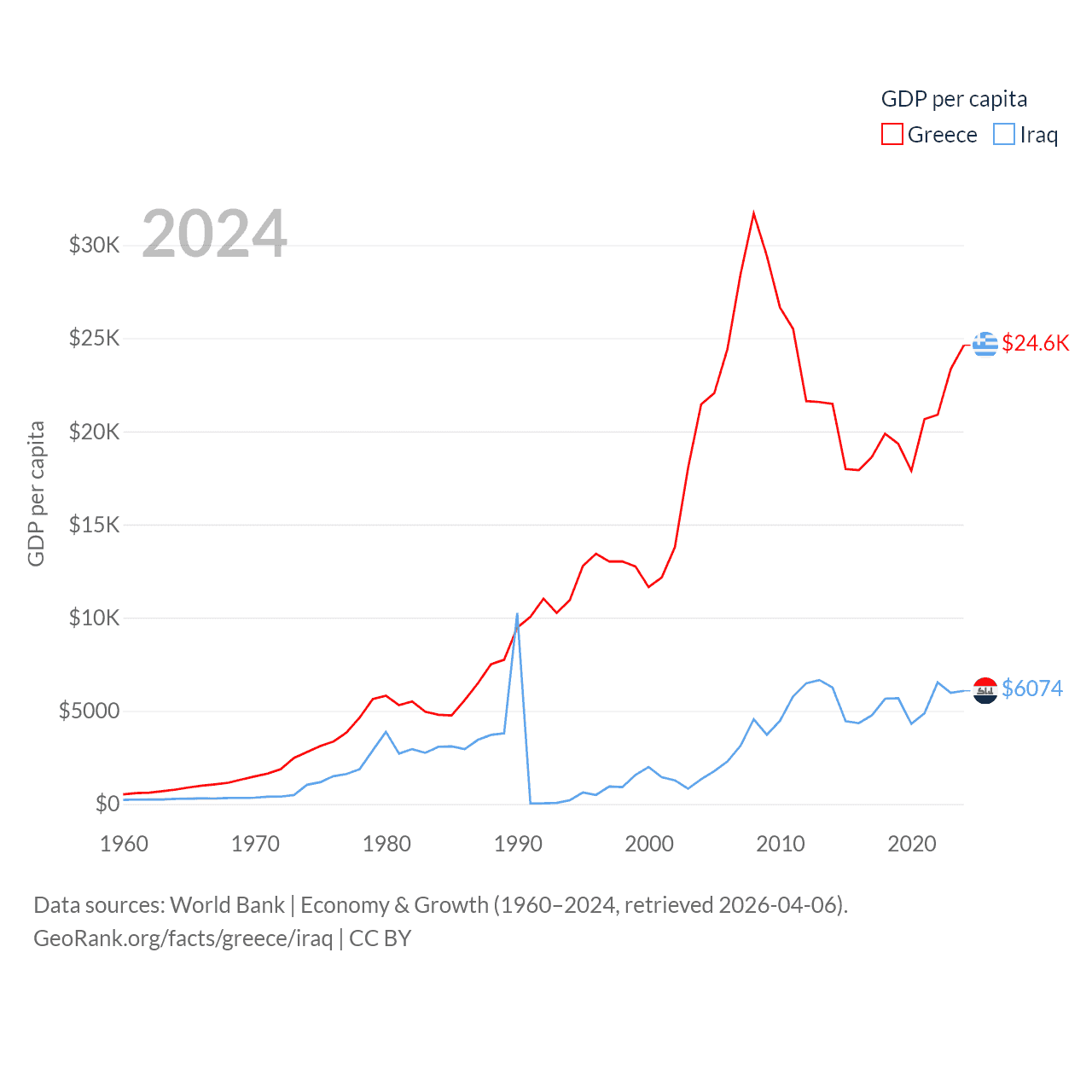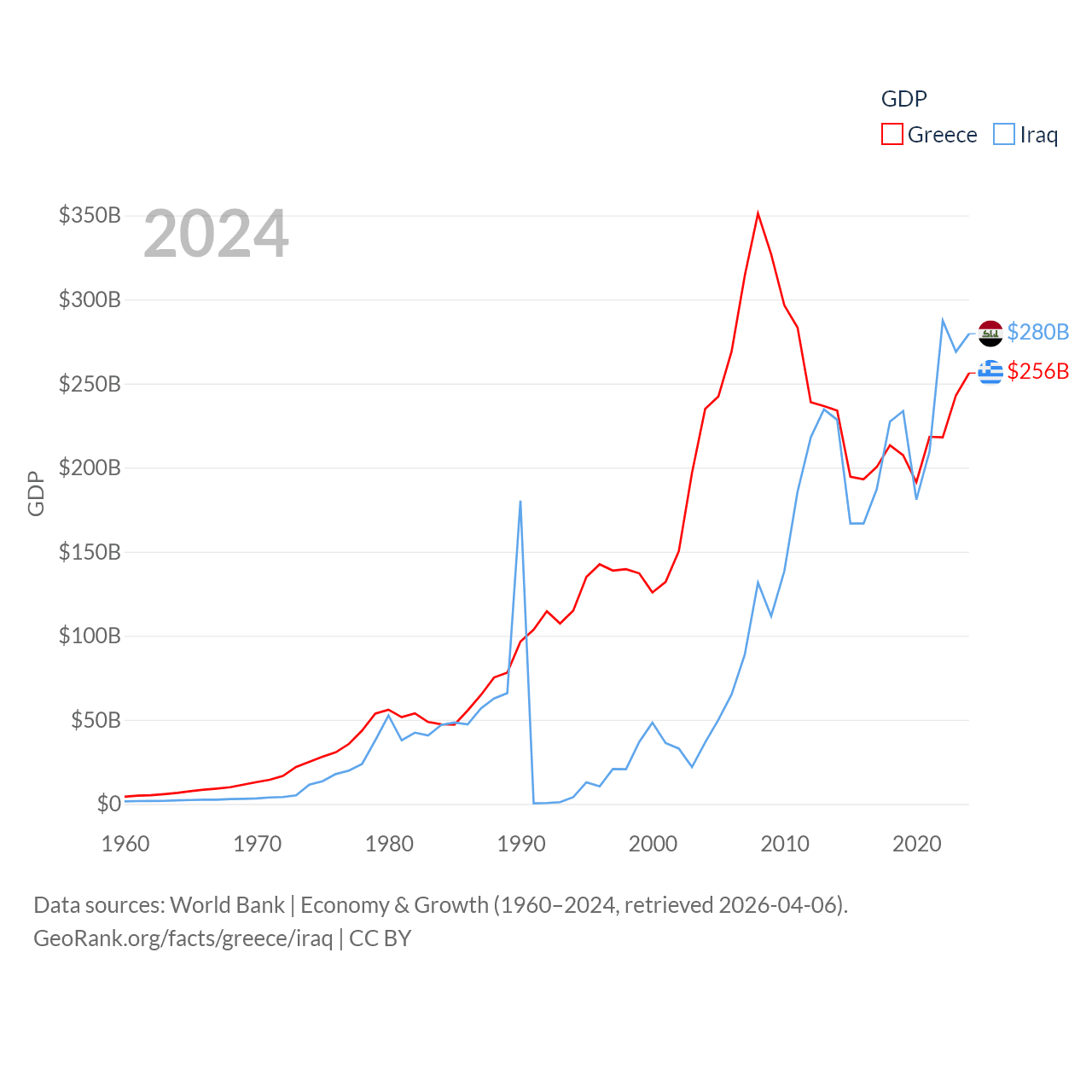 By GDP, Greece ranks 53/197 ($256B) and Iraq ranks 50/197 ($280B). By GDP per capita, Greece ranks 49/197 ($24,626), while Iraq ranks 113/197 ($6,074).