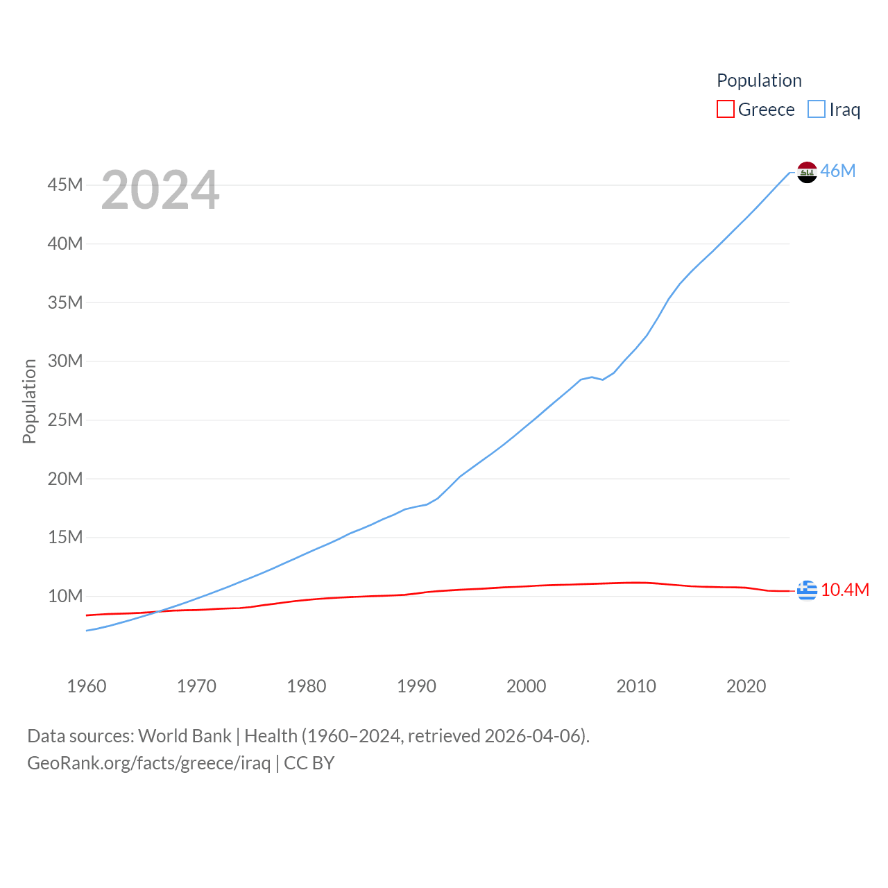Greece has a population of 10.4M (ranked 94/197), compared with 46M in Iraq (ranked 34/197). Greece's land area is 49,769 sq mi versus 167,619 sq mi for Iraq (ranked 95th vs. 57th).