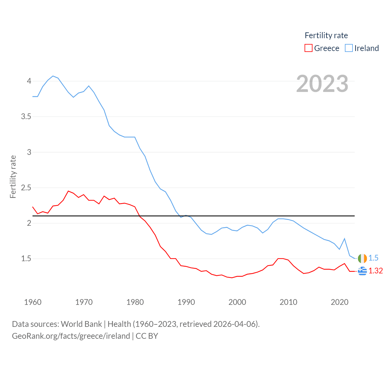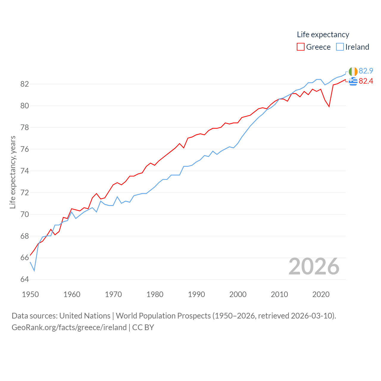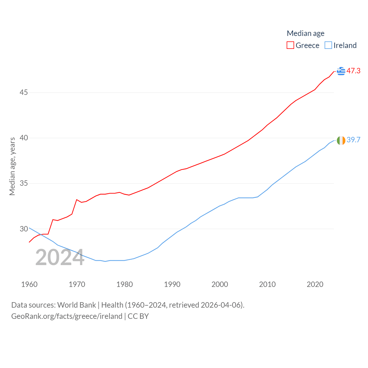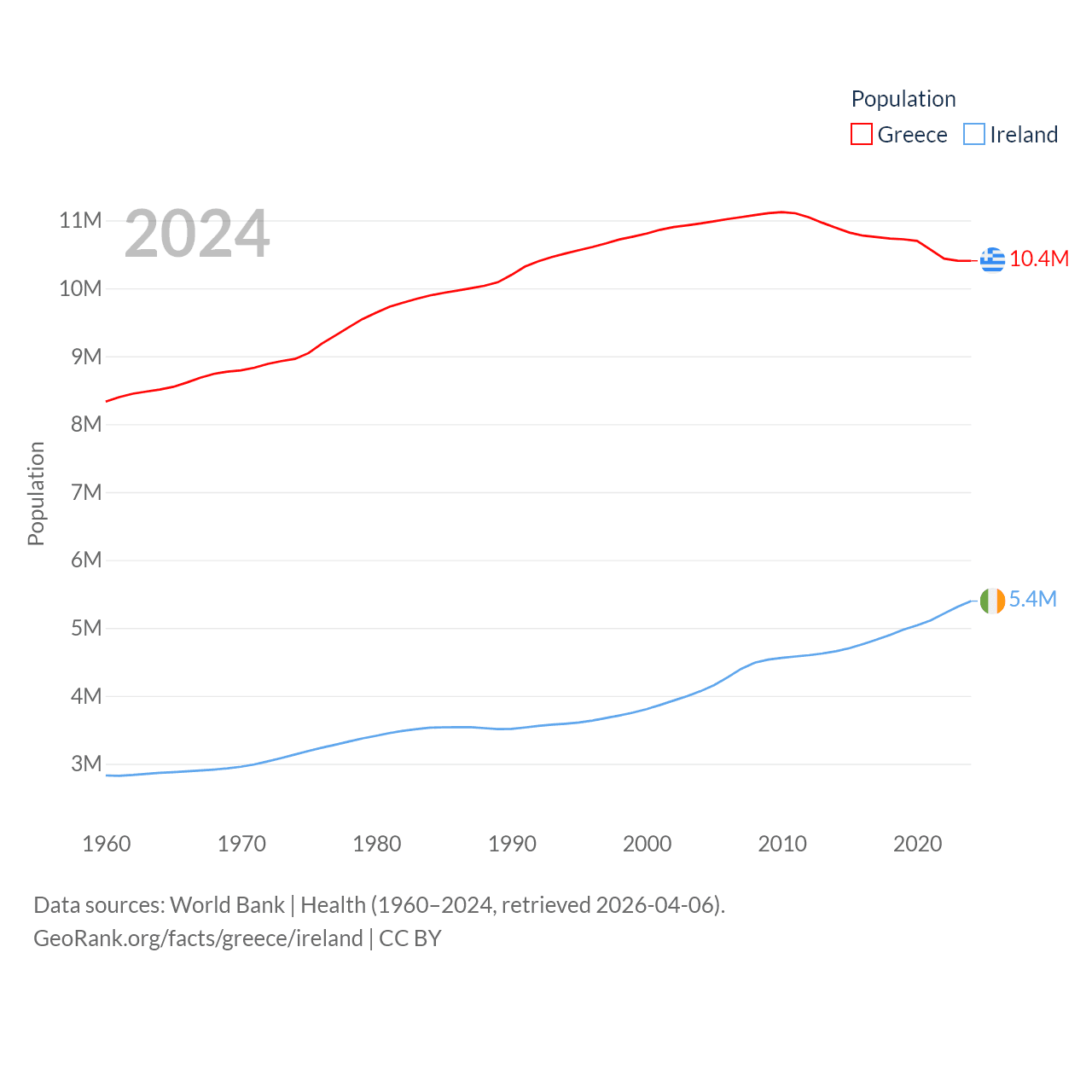 Greece has a population of 10.4M (ranked 94/197), compared with 5.4M in Ireland (ranked 120/197). Greece's land area is 49,769 sq mi versus 26,599 sq mi for Ireland (ranked 95th vs. 119th).