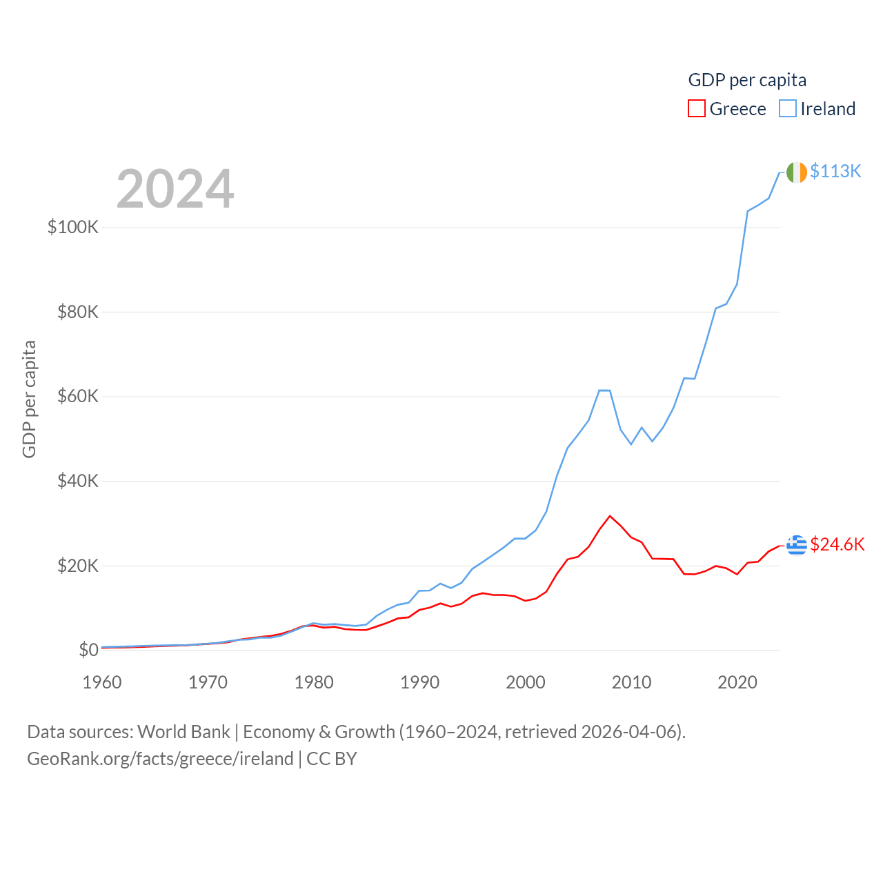 By GDP, Greece ranks 53/197 ($256B) and Ireland ranks 25/197 ($609B). By GDP per capita, Greece ranks 49/197 ($24,626), while Ireland ranks 4/197 ($112,895).