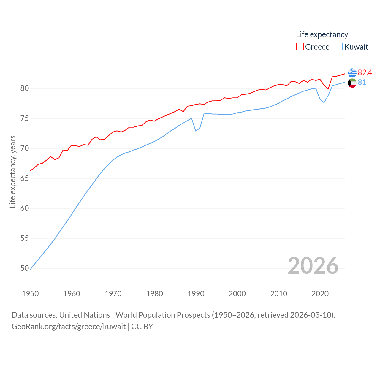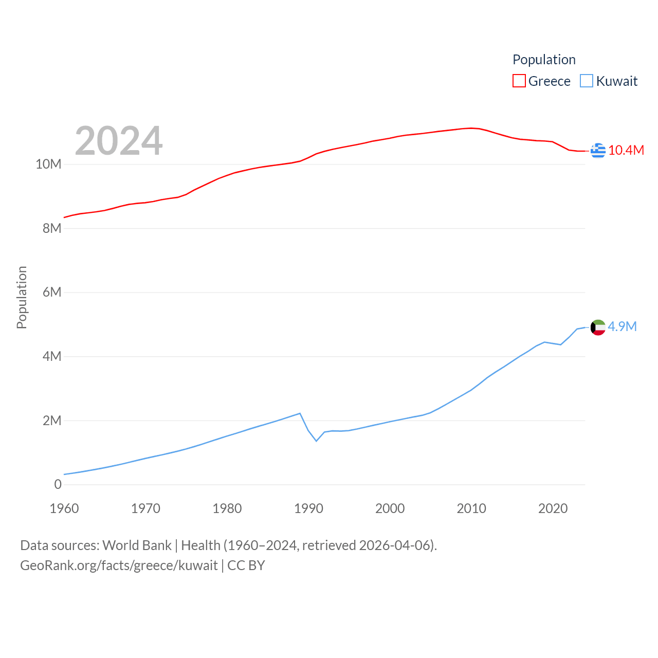 Greece has a population of 10.4M (ranked 94/197), compared with 4.9M in Kuwait (ranked 127/197). Greece's land area is 49,769 sq mi versus 6,880 sq mi for Kuwait (ranked 95th vs. 153rd).