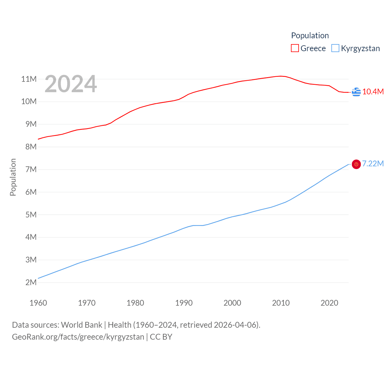 Greece has a population of 10.4M (ranked 94/197), compared with 7.22M in Kyrgyzstan (ranked 106/197). Greece's land area is 49,769 sq mi versus 74,054 sq mi for Kyrgyzstan (ranked 95th vs. 86th).