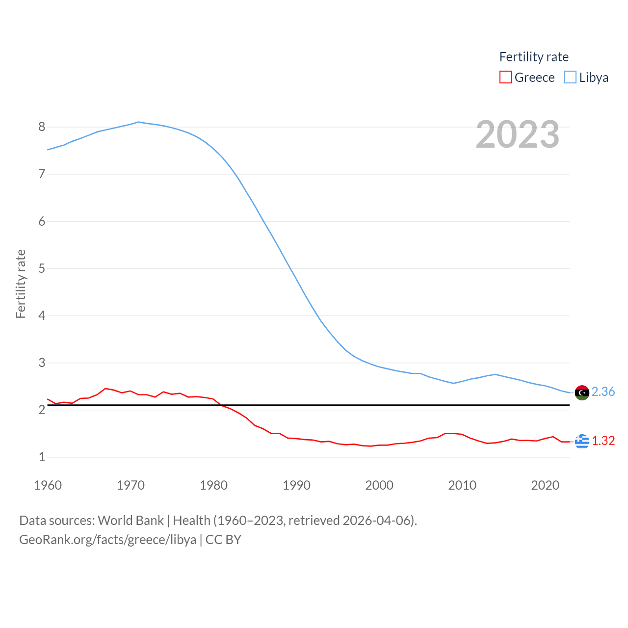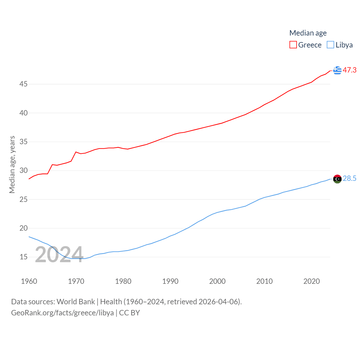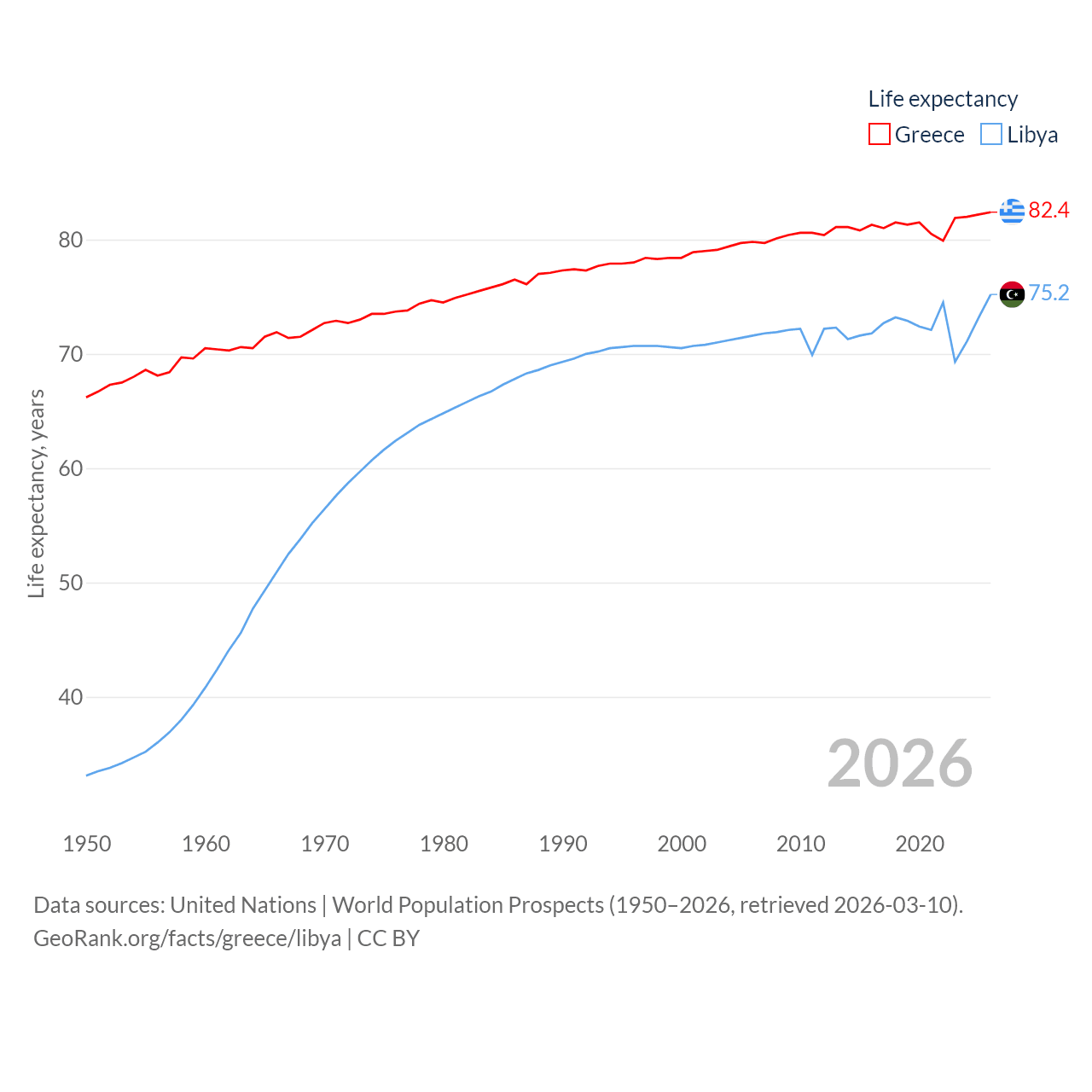 Greece has a population of 10.4M (ranked 94/197), compared with 7.38M in Libya (ranked 105/197). Greece's land area is 49,769 sq mi versus 679,362 sq mi for Libya (ranked 95th vs. 16th).