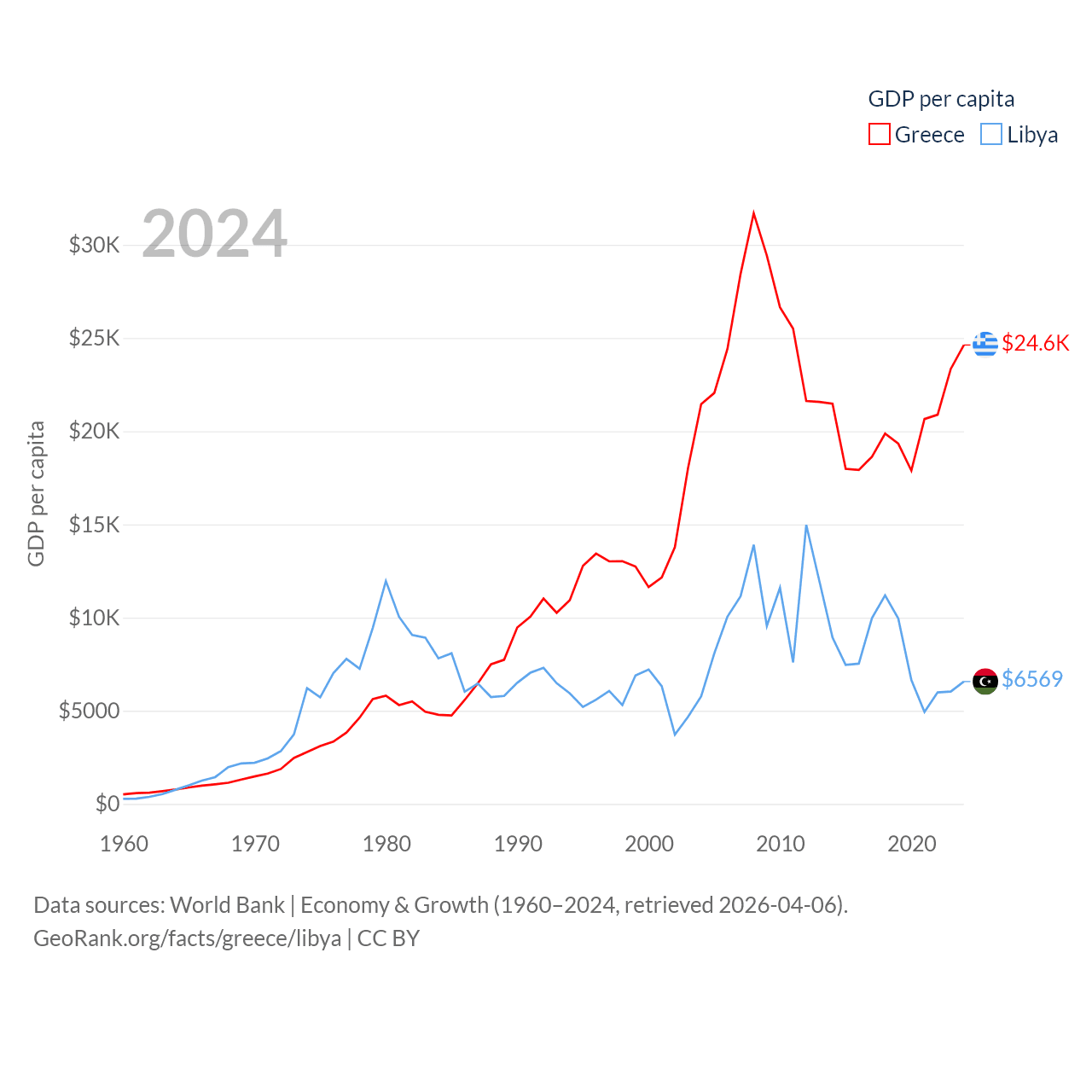 By GDP, Greece ranks 53/197 ($256B) and Libya ranks 95/197 ($48.5B). By GDP per capita, Greece ranks 49/197 ($24,626), while Libya ranks 107/197 ($6,569).
