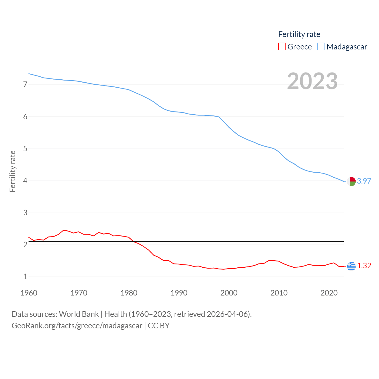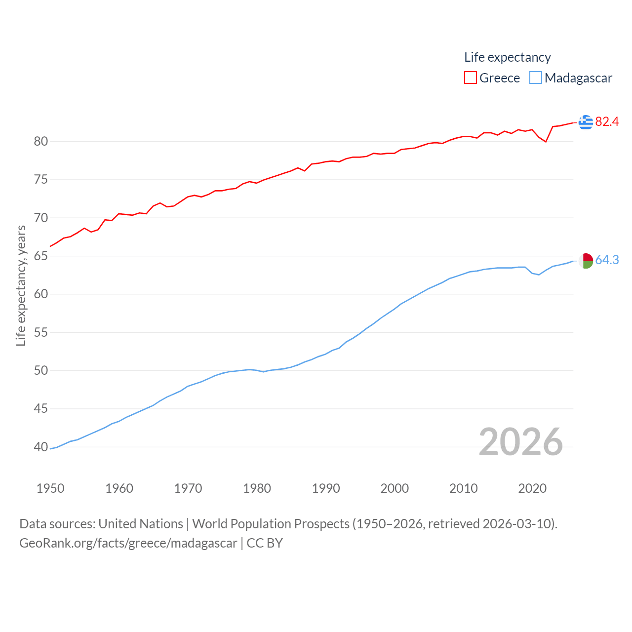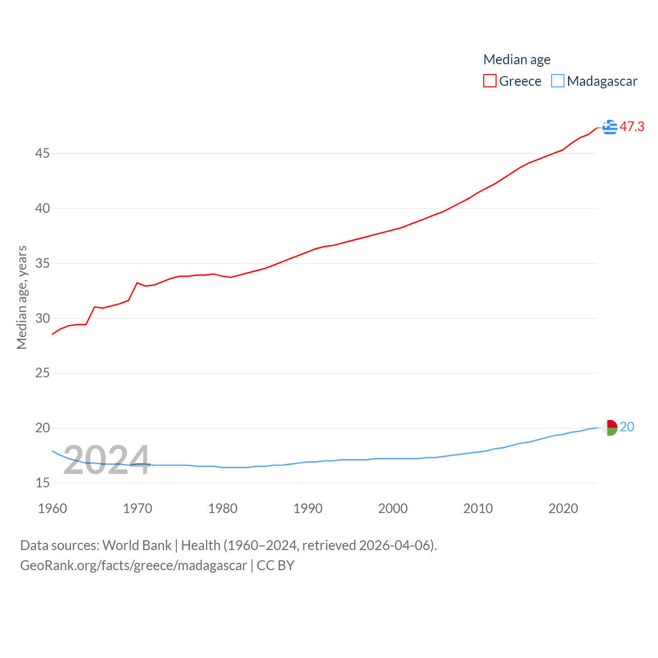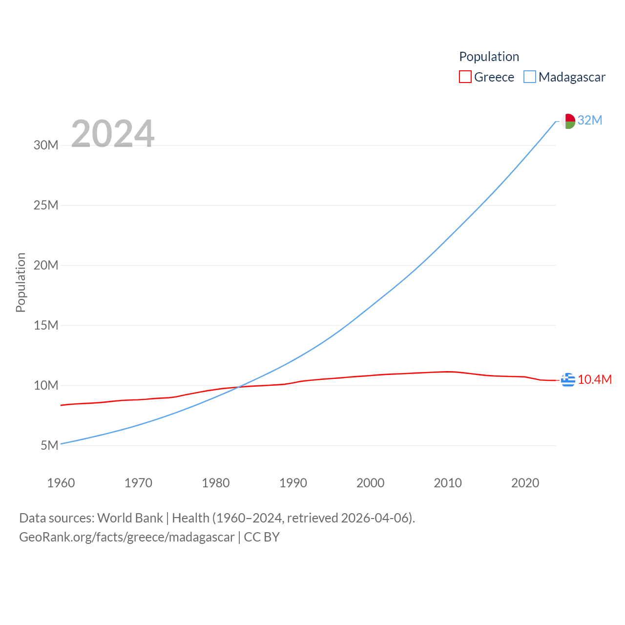 Greece has a population of 10.4M (ranked 94/197), compared with 32M in Madagascar (ranked 49/197). Greece's land area is 49,769 sq mi versus 224,634 sq mi for Madagascar (ranked 95th vs. 44th).