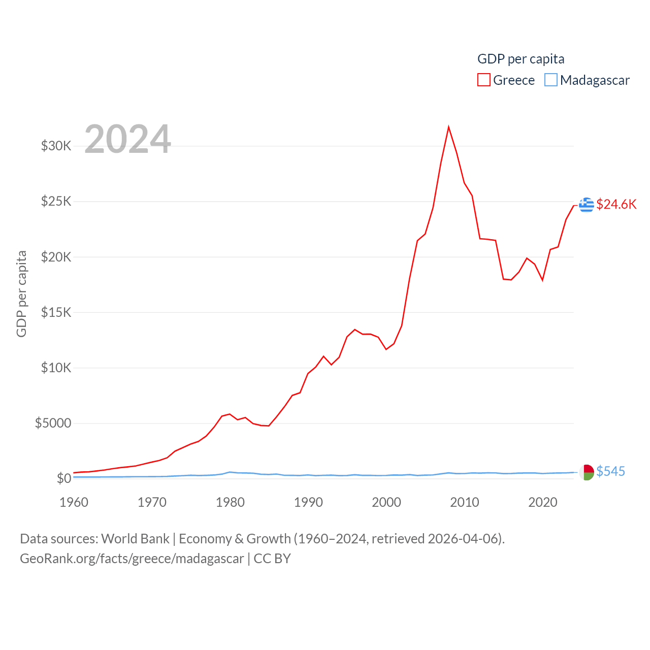 By GDP, Greece ranks 53/197 ($256B) and Madagascar ranks 136/197 ($17.4B). By GDP per capita, Greece ranks 49/197 ($24,626), while Madagascar ranks 193/197 ($545).