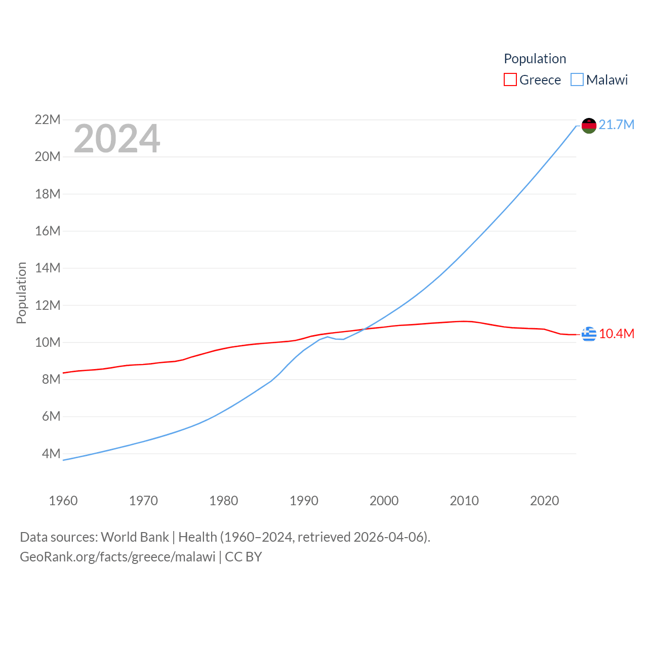 Greece has a population of 10.4M (ranked 94/197), compared with 21.7M in Malawi (ranked 62/197). Greece's land area is 49,769 sq mi versus 36,402 sq mi for Malawi (ranked 95th vs. 107th).