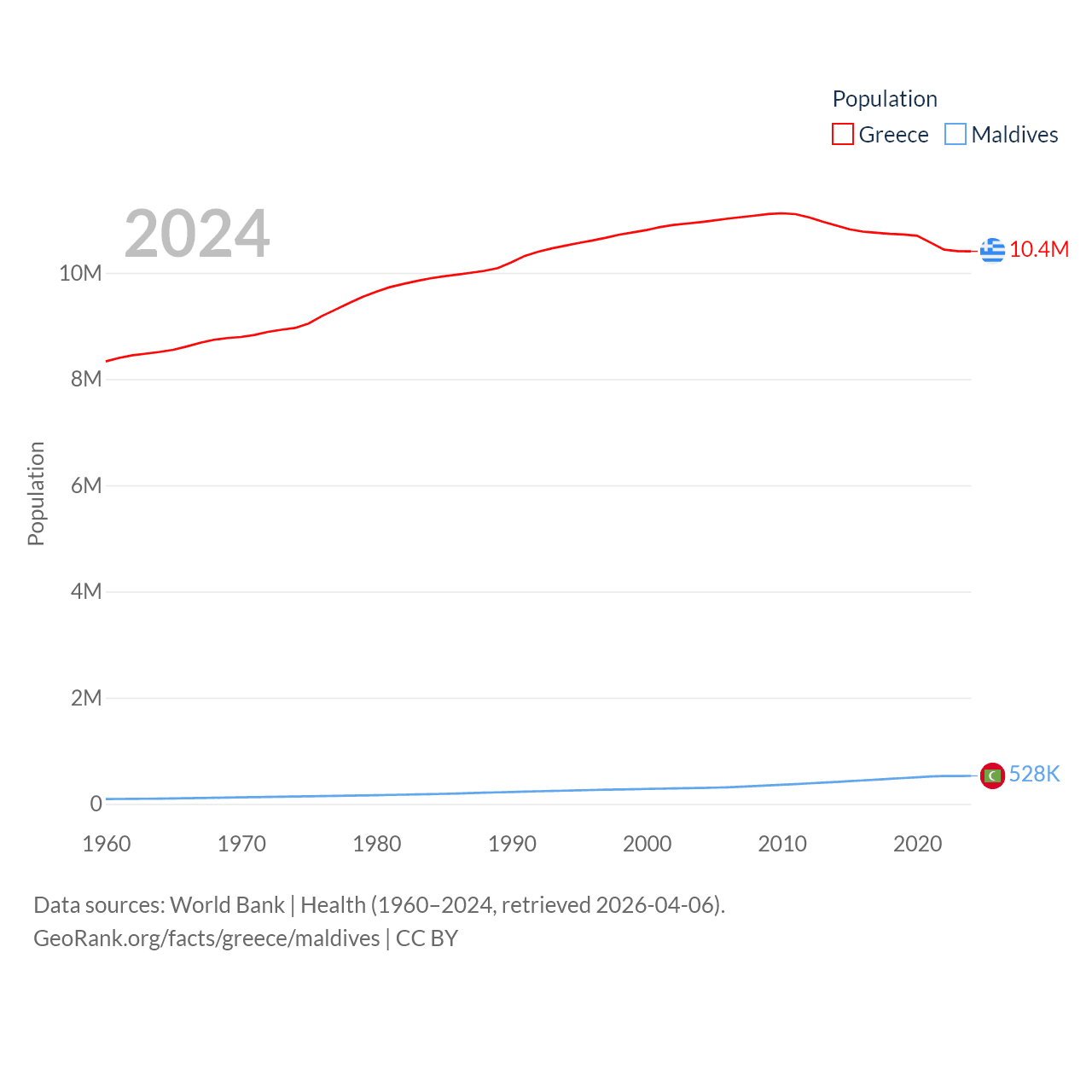 Greece has a population of 10.4M (ranked 94/197), compared with 528K in Maldives (ranked 168/197). Greece's land area is 49,769 sq mi versus 115.1 sq mi for Maldives (ranked 95th vs. 188th).