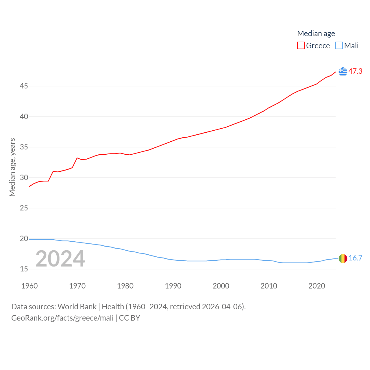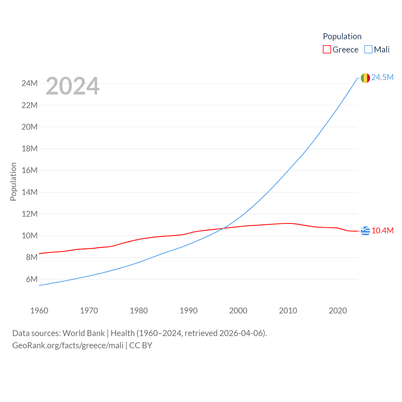 Greece has a population of 10.4M (ranked 94/197), compared with 24.5M in Mali (ranked 58/197). Greece's land area is 49,769 sq mi versus 471,118 sq mi for Mali (ranked 95th vs. 23rd).