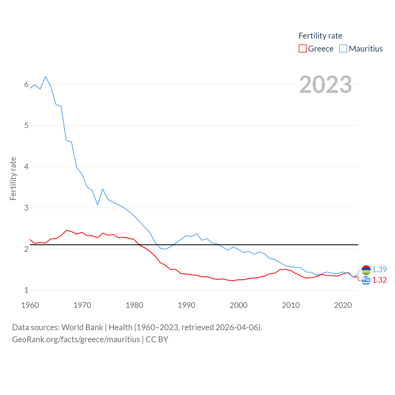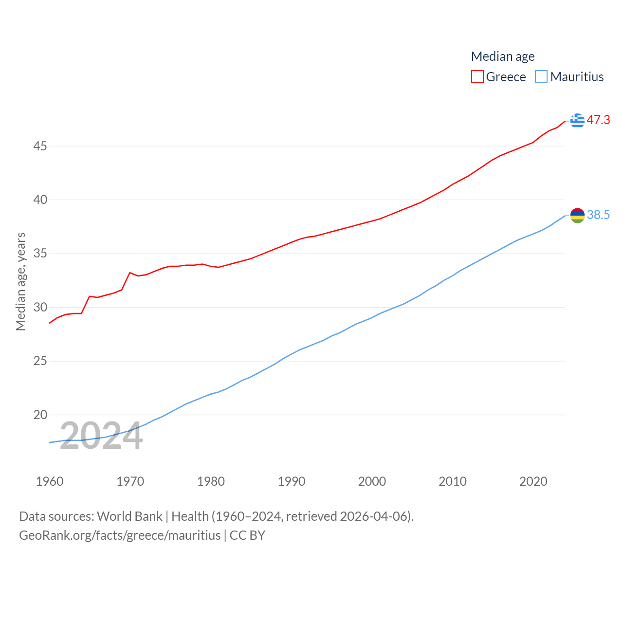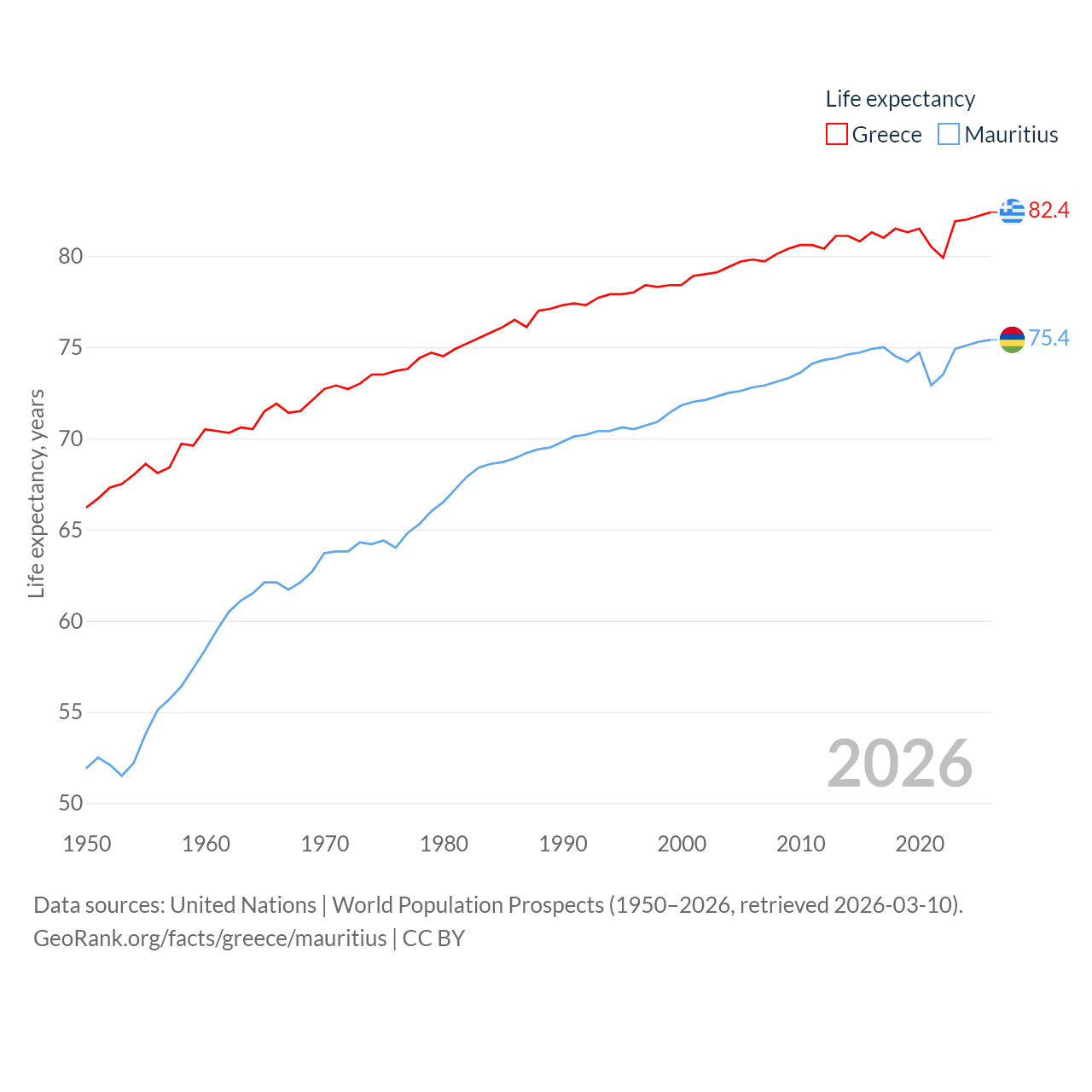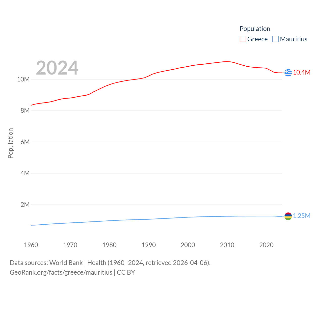 Greece has a population of 10.4M (ranked 94/197), compared with 1.25M in Mauritius (ranked 156/197). Greece's land area is 49,769 sq mi versus 771 sq mi for Mauritius (ranked 95th vs. 170th).